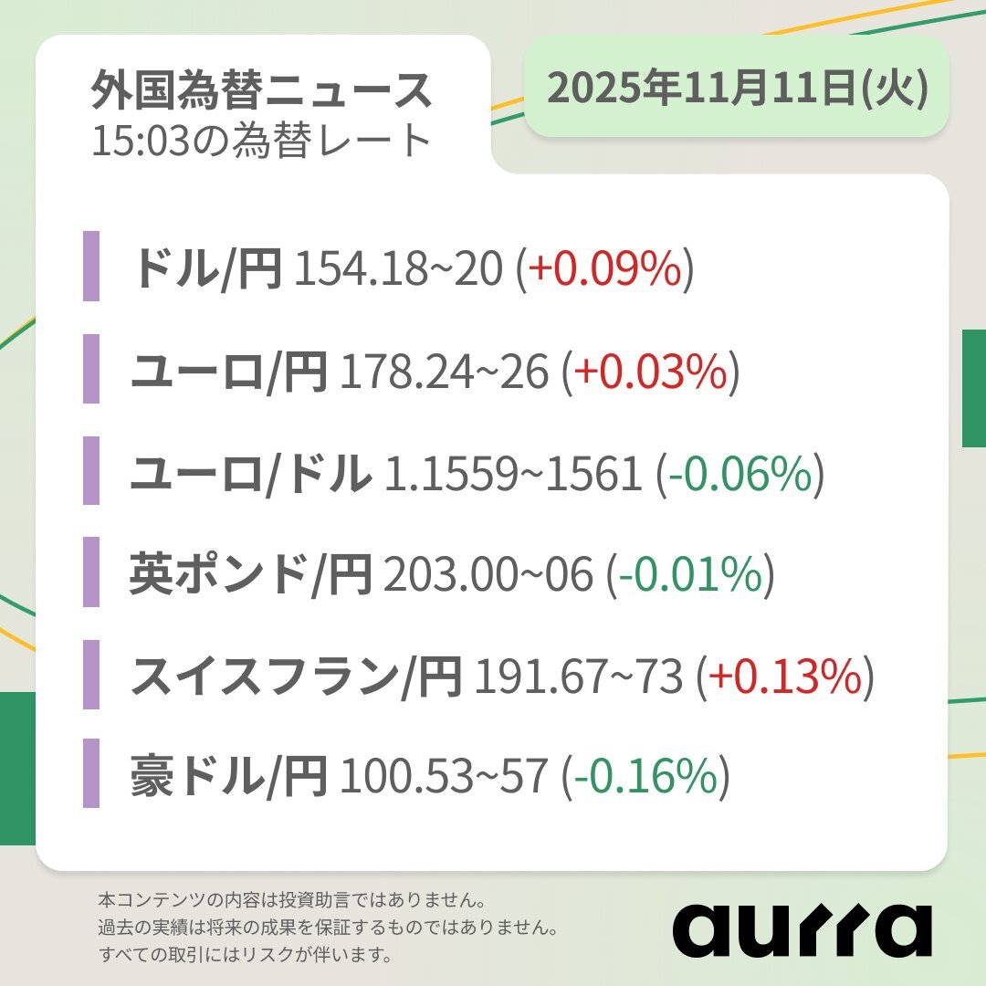 💱 外国為替市場ニュース|2025年11月11日(火) 15時16分の #為替レート です。 ・ドル/円 $USDJPY 154.18~20 (+0.09%▲) ・ユーロ/円 $EURJPY 178.24~26 (+0.03%▲) ・ユーロ/ドル $EURUSD 1.1559~1561 (-0.06%▽) ・英ポンド/円 $GBPJPY 203.00~06 (-0.01%▽) ・スイスフラン/円 $CHFJPY 191.67~73 pic.x.com/4nOn56bv6y x.com/aurra_jp/statu…