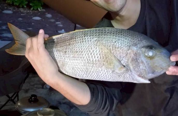 「バえる画像」を良しとしないおじさんたちですが、釣れた魚に関しては違います。40㎝級のシロダイ(沖縄で「シルイユー」)です。刺身、ブイヤベース、鯛飯にしていただきました。Orionビールが足りなくなるかもしれません。 #沖縄 #無人島 #キャンプ pic.x.com/hhlM2ytjam