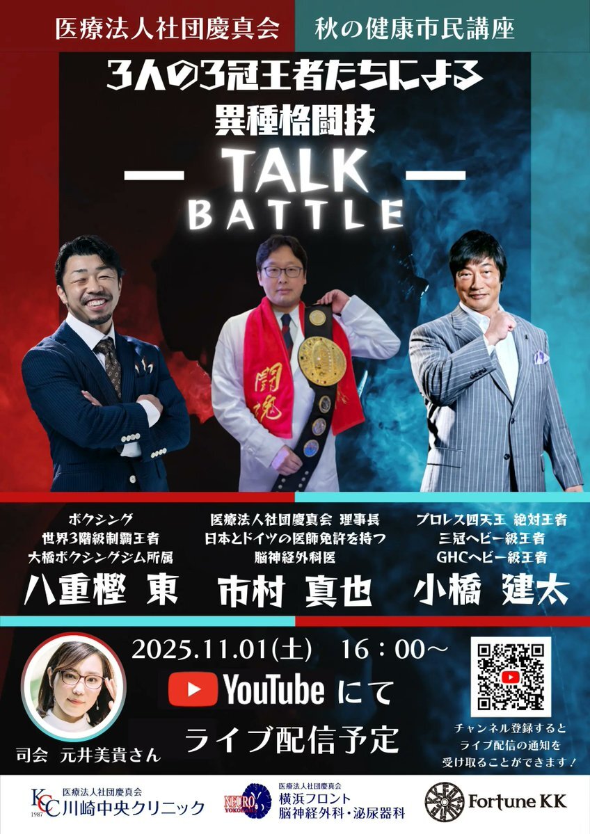 いよいよ 11/1(土)秋の健康市民講座 近づいてまいりました! 川崎中央クリニック市村先生、ボクシング世界3階級制覇王者八重樫さんとのトークバトル! Youtubeにてライブ配信があります。お楽しみに! #川崎中央クリニック #医療法人社団慶真会 #八重樫東 #小橋建太 #元井美貴 #市民講座