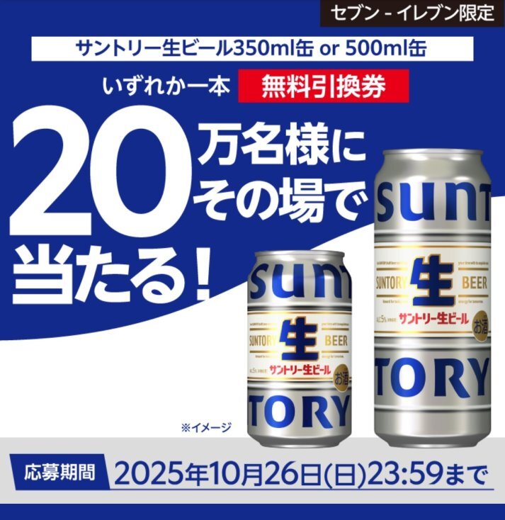 サントリー生ビール 20万名様にその場で当たるキャンペーン🍺 ・対象コンビニ→セブンイレブン ・応募期間→10/26まで 今2垢とも当たりました👍 tinyurl.com/nama1026 #懸賞 #懸賞垢 #無料配布 pic.x.com/rYLEyabVr7