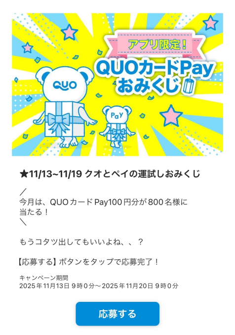 QUOカードPay おみくじ 最大9,090円が 合計900名に当たる🎁 今週もアプリが 当たりやすいよ~🎯 〜〜〜〜〜〜〜〜 💳QUOカードPayアプリ 💳QUOカードPay公式LINE 〜〜〜〜〜〜〜〜 どちらも抽選 はじまってます~ 今回アプリは 100円×800名🎁 その場で当たる キャンペーンが 今週もダブル開催