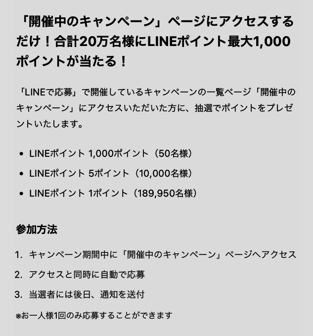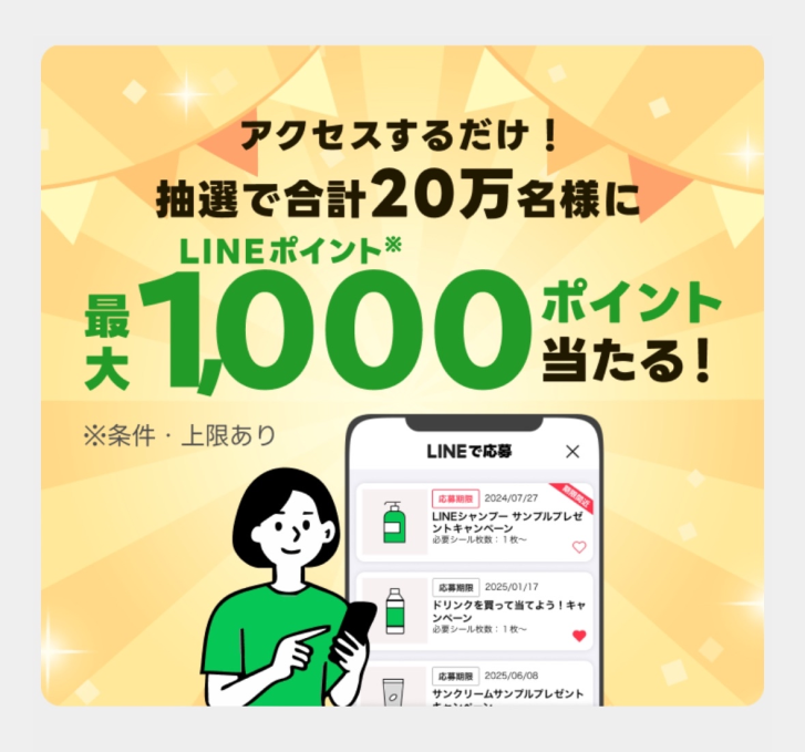 LINEで応募🎯 合計20万名様に LINEポイント 最大1,000ポイント 当たる! ~~~~~~~~ 「開催中のキャンペーン」ページに アクセスするだけ!キャンペーン ~~~~~~~~ #懸賞 #懸賞垢 #無料配布 ■応募方法 キャンペーン期間中に 「開催中のキャンペーン」ページへアクセス pic.x.com/TtPClDPlOZ