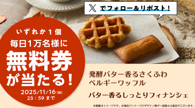 ローソン ベルギーワッフル/フィナンシェが当たる X抽選キャンペーン 1日目♪ ■プレゼント賞品 ・発酵バター香るさくふわベルギーワッフル ・バター香るしっとりフィナンシェ ローソン標準価格 各種178円(税込) 1日あたり1万名様 合計5万名様 フォロー&リポストで抽選 x.com/akiko_lawson/s…