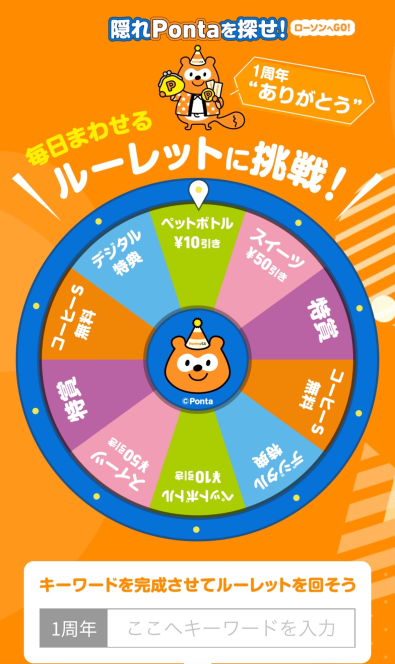 Pontaパス 1周年記念🎉✨ キーワードを 探し出して おトクな ルーレットに挑戦🎯 ~~~~~~~~ ローソンへ行って 隠れPontaを探せ ~~~~~~~~ LAWSON お買い物券 明治ミルクチョコレート ギフトBOX すいすて SWEET STEADY サイン入りグッズ ローソン無料クーポンが その場で当たる