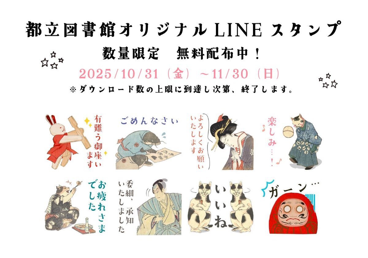 ✨オリジナルLINEスタンプ✨ ✅無料配布 ✅数量限定 📅配布期間:10/31-11/30 Web展示「#江戸のおしごと」で配布中➡️library.metro.tokyo.lg.jp/sp-bunkaweek/2… 📚#東京文化財ウィーク 2025参加企画展開催記念📚 #都立図書館 #特別文庫室 所蔵資料を使った #LINEスタンプ #無料配布 pic.x.com/DW0dGdLQIk
