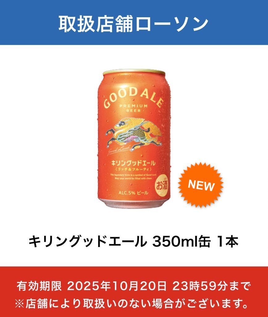 新発売 グッドエール🍻 期間短め 複数当選したので 無料配布するよ~❤ 🎁プレゼント企画 第321弾🎁 キリングッドエール 350ml缶×1本 当選品 ・ミニストップ ・ローソン ・セブンイレブン コンビニ無料クーポン 抽選で1名様に当たる キャンペーン🎯 #8号の配布企画 #懸賞 #無料配布 pic.x.com/di503Xiout x.com/8coupon8/statu…
