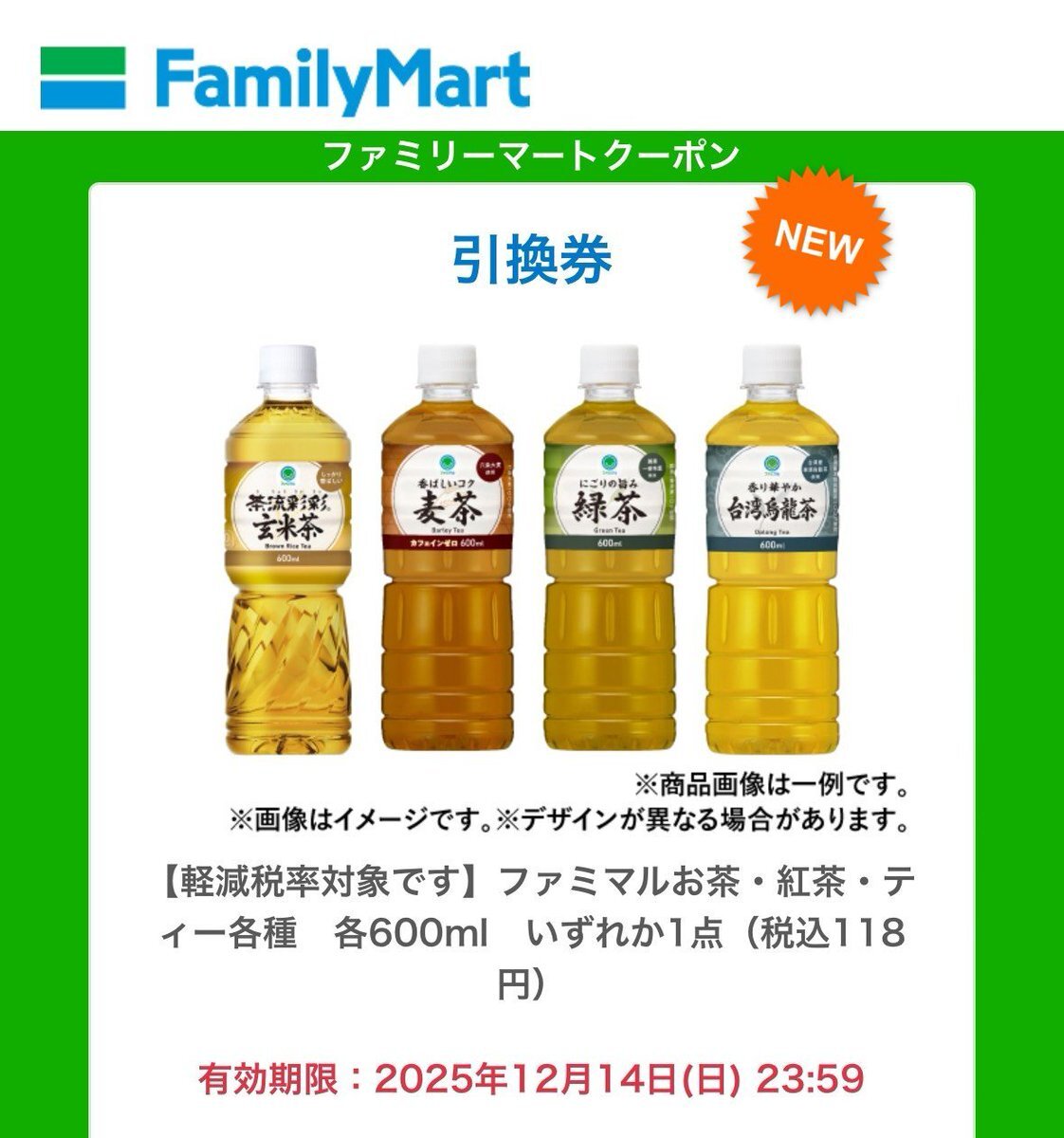 ファミマのお茶 紅茶・ティー各種類 テレボートの抽選で 当選したので 無料で配布するよ~❤ 🎁プレゼント企画 第382弾🎁 ファミリーマート ファミマル お茶・紅茶・ティー 各種 各600ml いずれか1本もらえる 無料クーポン 抽選で1名様🎯 #8号の配布企画 #懸賞 #無料配布 #懸賞仲間募集中 ~ ~ pic.x.com/WWohAiHCTa x.com/8coupon8/statu…