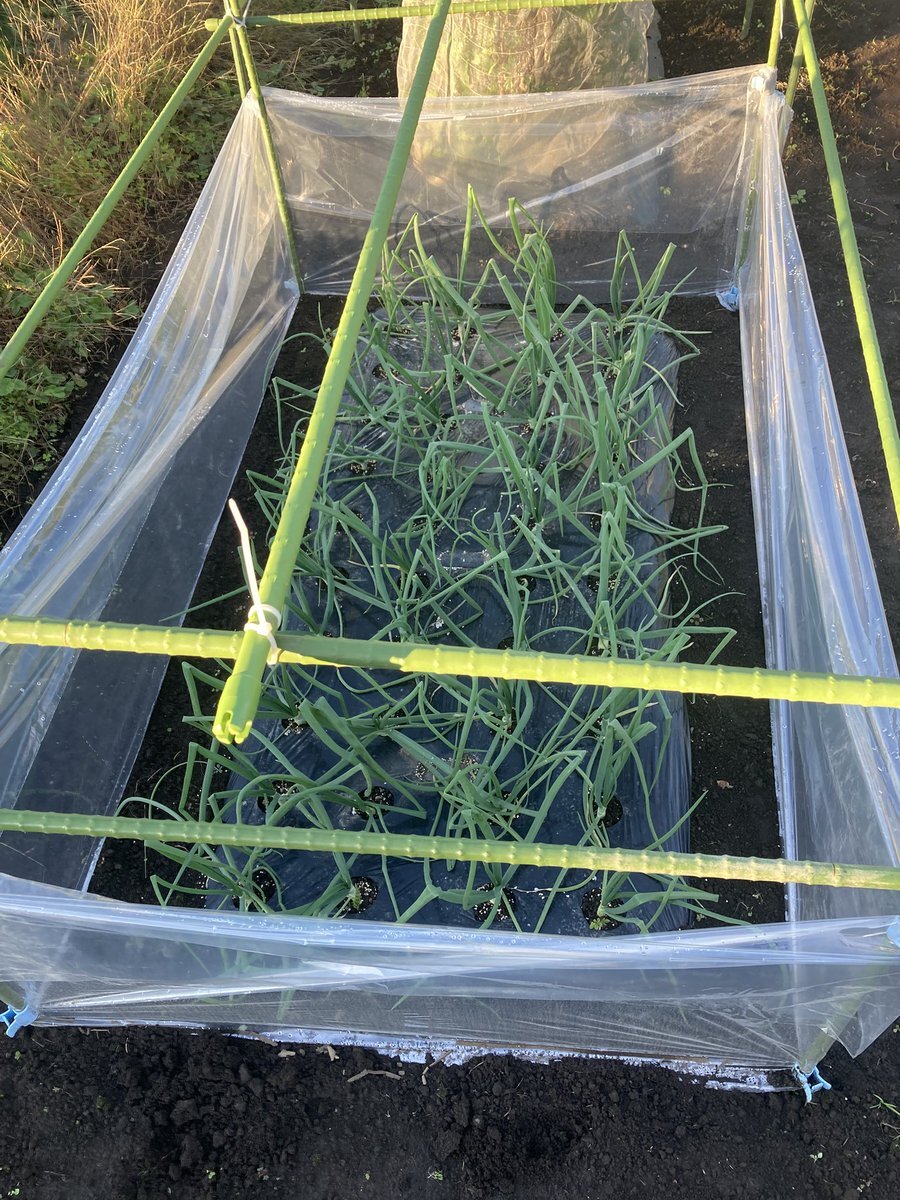 【野菜栽培】ホーム玉ねぎを囲う 気温の変化が大きく、今年も球根が大きくなり始めません ◯寒さを防ぐためにアンドン方式で透明マルチで囲って見ました 来週から霜が降りる日が続きそうなので、屋根を付けます。年末までに、小ぶりの玉ねぎが収穫できて欲しいな⁉️ #家庭菜園 #無農薬栽培 pic.x.com/TkUQ1GrRXq