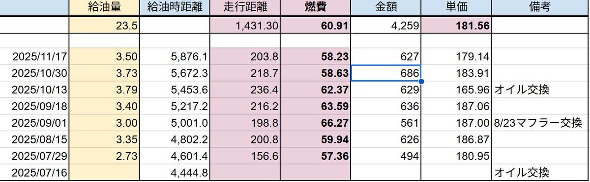 フレア[DAA-MJ55S]を受け取ってから3回目の給油。 総走行距離 21,538km 乗り始めてからの走行距離 602.0km 前回の給油から今回の給油をするまでの走行距離 419.1km 乗り始めてからの表示平均燃費 24.0km 給油量 19.39L 満タン法での実燃費 419.1km/19.39L=21.6km/L #燃費 pic.x.com/FFsk7zFaWa