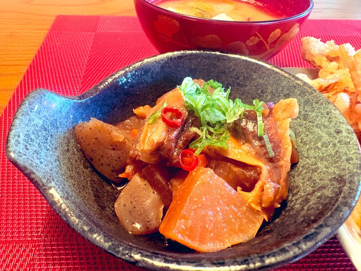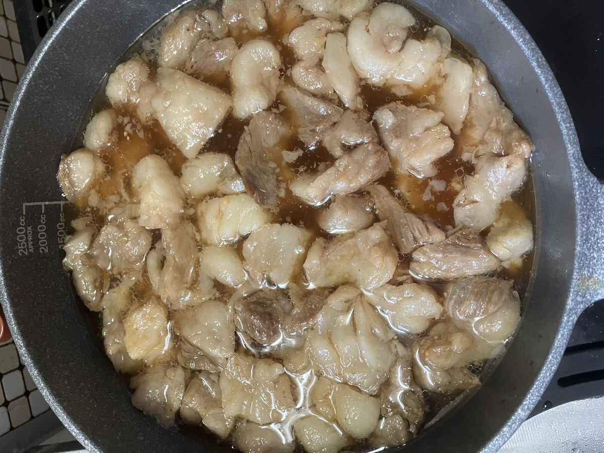 国産牛の牛スジ(脂身多め)、煮込んだ。 26cmのフライパンいっぱいの牛スジが202円だったの。 g30円で700gね。 あとは火を止めて馴染ませるだけ。 味見したら柔らかかったわ #牛スジ煮込み pic.x.com/ThmqNfT6n7