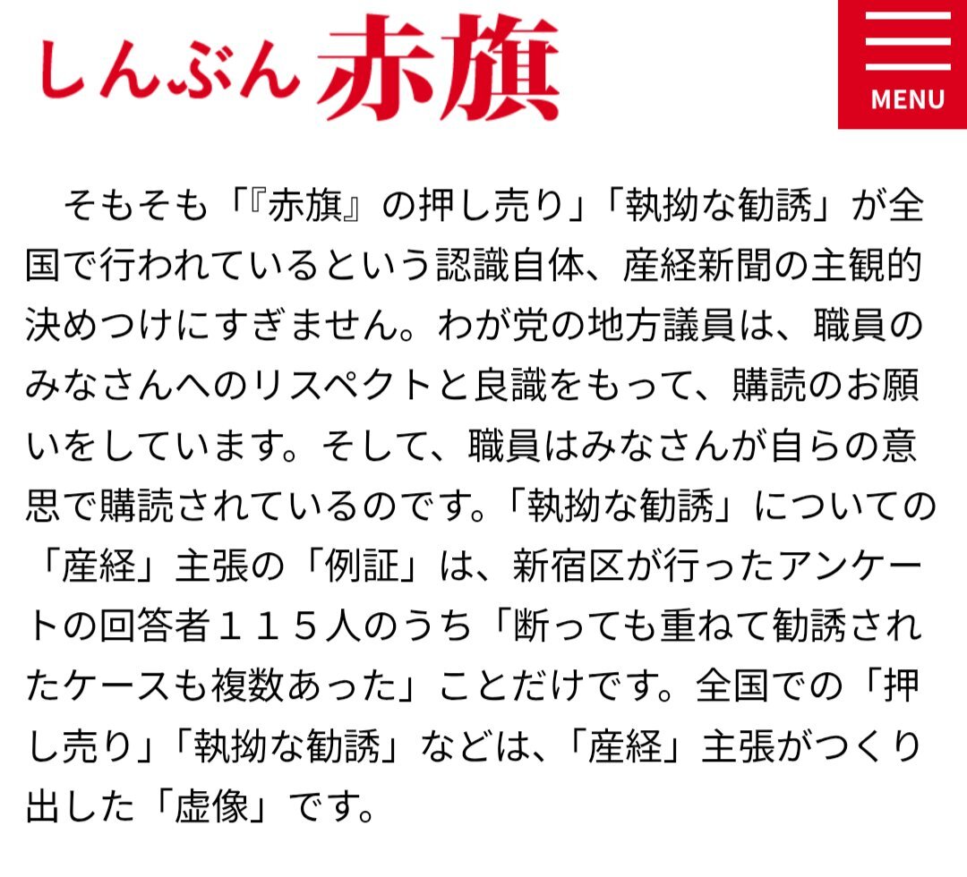 産経新聞の「赤旗押し売り」記事に対する赤旗の反論見たけど 赤旗「断っても重ねて勧誘されたケースも複数あった」事だけです って…再勧誘を正当化してんの?これ 怖いんだけど てか断っても再勧誘って法律に違反しないの? あと自らの意思で購入したんだ! って、どこかで聞いたセリフだな…