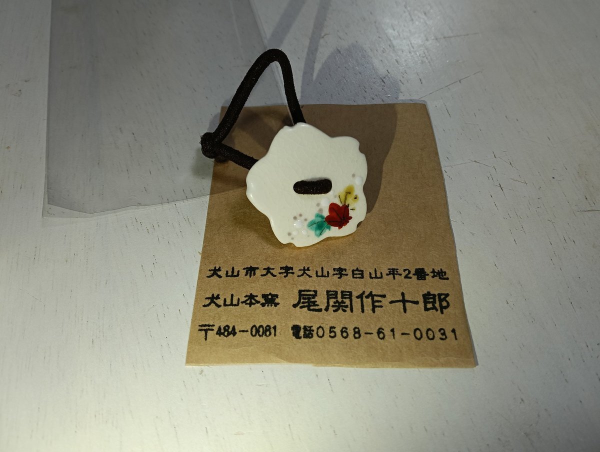 昨日、尾関作十郎陶房で買いました! ゴムを外して帯留めにする予定。 2つの穴をどうしようかな?糸を通してボタン風にしようと思ったけど金具を取り付けるから裏に糸を出したくないの。。 #あいたて博 #あいちたてもの博覧会 #犬山 pic.x.com/T5vkX7fvMs