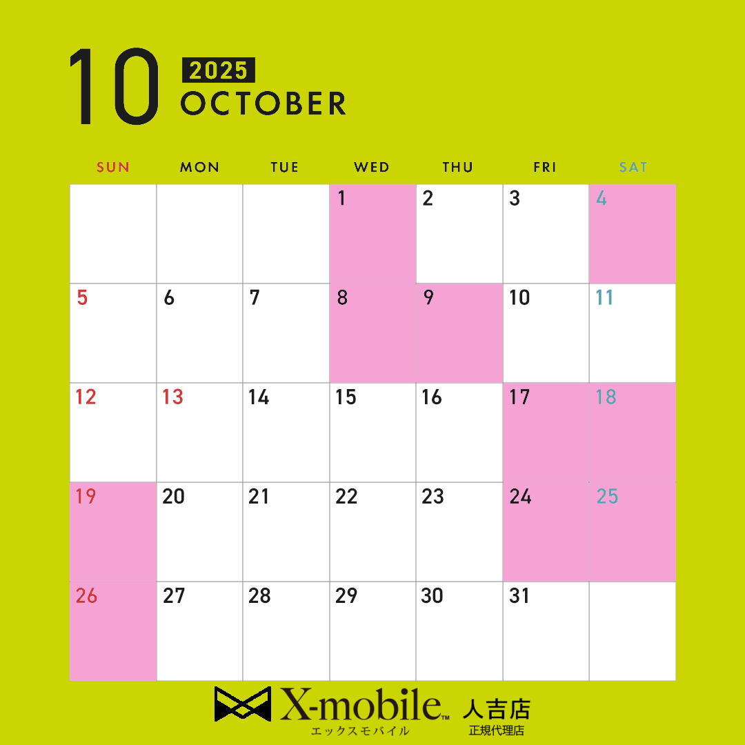 こんにちは❗ エックスモバイル人吉店です😊 10月の営業日カレンダーです 10月~11月は変則的な定休日となりますので、ご来店前にご確認をお願いいたします🙇 #人吉 #球磨 #エックスモバイル #エックスリペア #格安SIM #スマホ修理 #即日修理 #ガラスコーティング #モバイルWiFi #スマホお困り相談 pic.x.com/FVys4CSgil