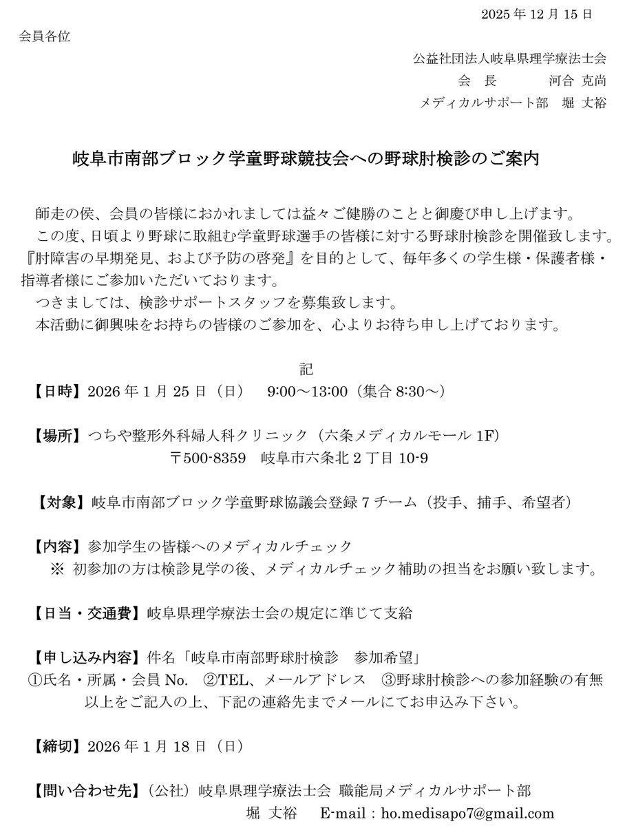 2025.12.15【メディカルサポート部からのお知らせ】 岐阜市南部ブロック学童野球競技会への野球肘検診サポートスタッフ募集のご案内(メディカルサポート部) 日時:令和8年1月25日(日)9:00~ ※詳しくは画像内募集要項をご参照下さい。 #岐阜県理学療法士会 #リハビリテーション #理学療法 #理学療法士 pic.x.com/9UEWSbEmwA
