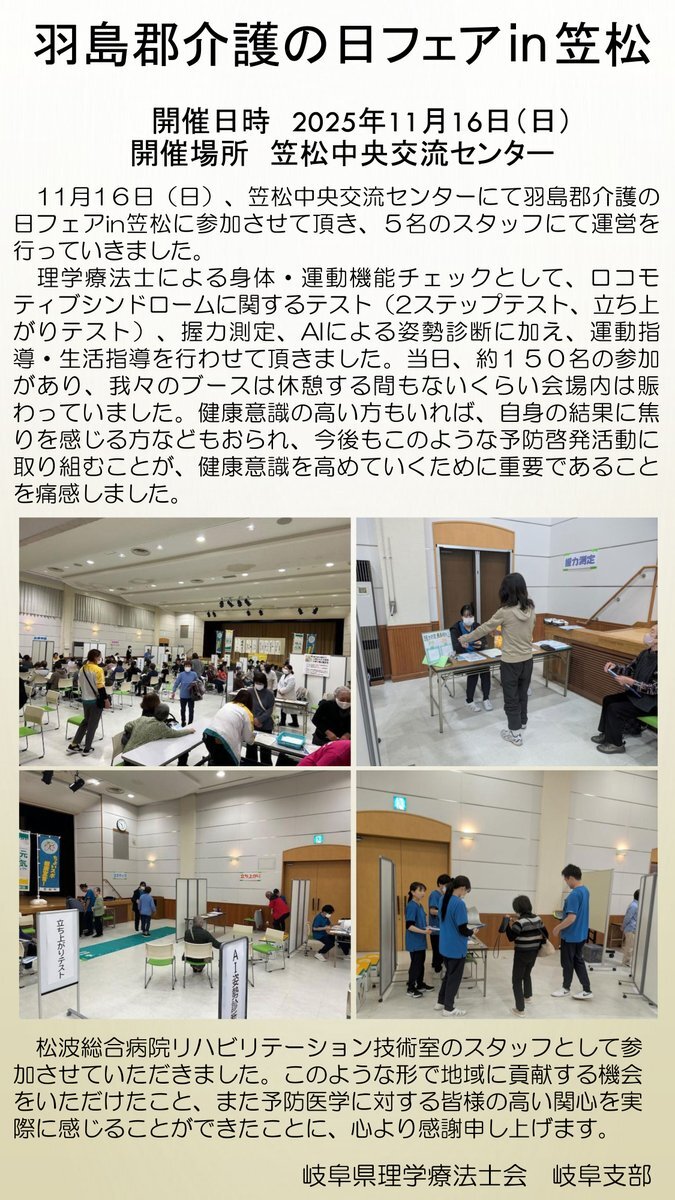 2025.12.11【岐阜県理学療法士会ニュース】 羽島郡介護の日フェア㏌笠松活動報告(岐阜支部) 2025年11月16日(日)に笠松中央交流センターで開催されました。 #岐阜県理学療法士会 #岐阜県理学療法士会ニュース #リハビリテーション #理学療法 #理学療法士 pic.x.com/SzbPIvldVL