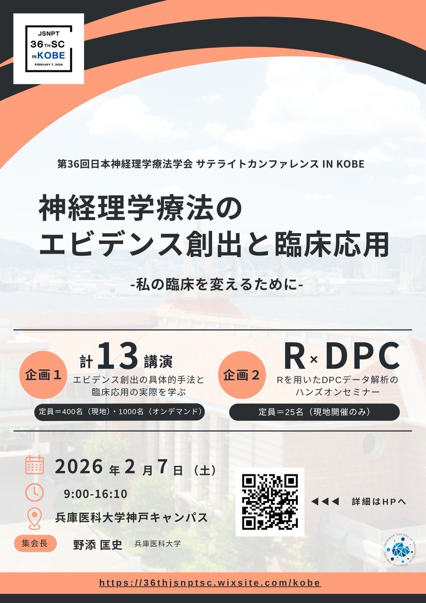 2025.12.16【県外研修のお知らせ】 第36回日本神経理学療法学会サテライトカンファレンスinKOBEのご案内(兵庫県) 36thjsnptsc.wixsite.com/kobe 日時:2026年2月7日(土) 会場:兵庫医科大学 神戸キャンパス #岐阜県理学療法士会 #第36回日本神経理学療法学会 #リハビリテーション #理学療法 #理学療法士 pic.x.com/nySqOL2Bea