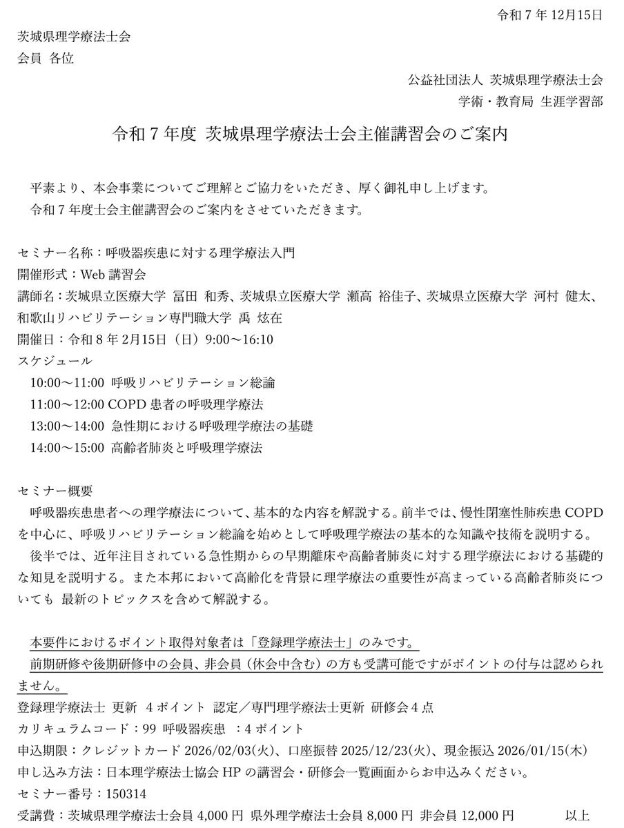 2025.12.17【県外WEB研修のお知らせ】 令和7年度 茨城県理学療法⼠会主催講習会のご案内(WEB開催) テーマ:呼吸器疾患に対する理学療法⼊⾨ ※詳しくは画像内開催要旨をご参照下さい #岐阜県理学療法士会 #茨城県理学療法士会 #リハビリテーション #理学療法 #理学療法士 pic.x.com/FFj2cvaflY