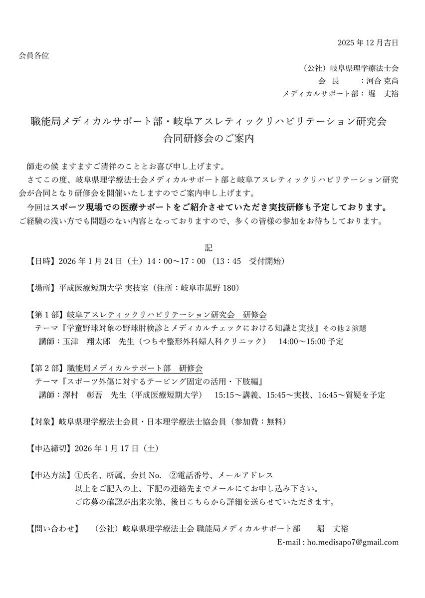 2025.12.12【メディカルサポート部からのお知らせ】 職能局メディカルサポート部・岐阜アスレティックリハビリテーション研究会合同研修会のご案内 gifu-pt.jp/pdf/kennai/202… 日時:2026年1月24日(土) 14:00~ 場所:平成医療短期大学 (岐阜市黒野180) #岐阜県理学療法士会 #リハビリテーション #理学療法 pic.x.com/RDy4YLLXA6