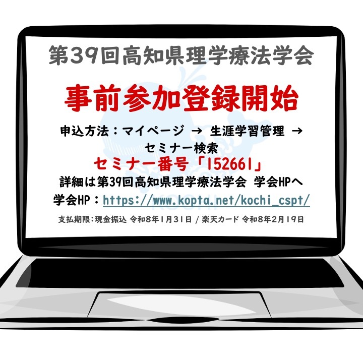 📢 第39回 高知県理学療法学会の参加申し込みが始まっています。 現地&オンラインのハイブリッド形式で開催予定です。学びを深め、臨床・研究の交流を広げましょう。 詳細・お申込みはこちら👇 🔗 kopta.net/kochi_cspt/ #高知県理学療法学会 #理学療法 #申し込み開始 #39KPTA pic.x.com/He7PtchjFj