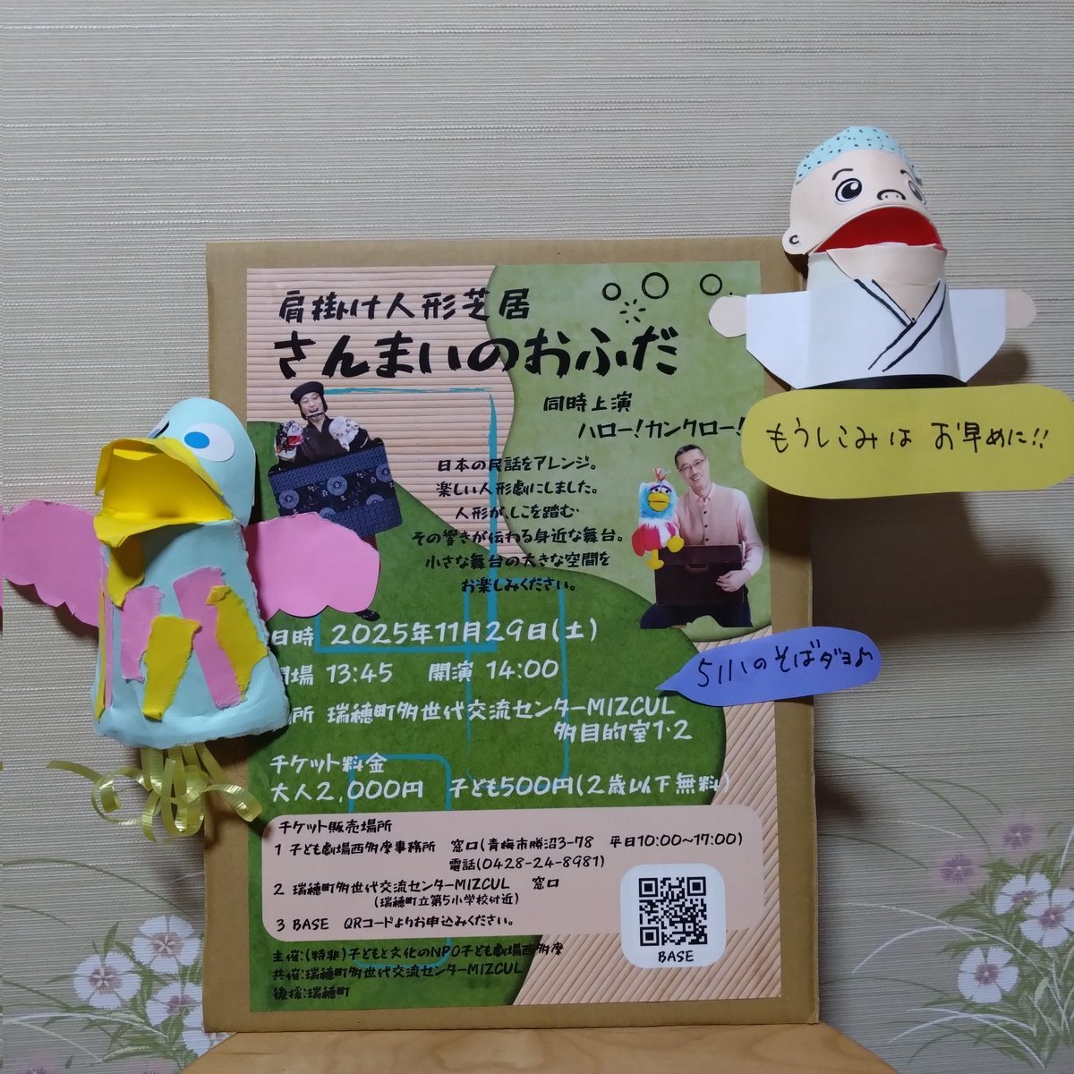 さんまいのおふだ 肩掛け人形芝居と腹話術のハローカンクローの2本立て 29(土)瑞穂町の5小そば、多世代交流センターミズカルにて チケット絶賛発売中♪ #人形劇 #瑞穂町 #多世代 pic.x.com/joTwSJtDvr