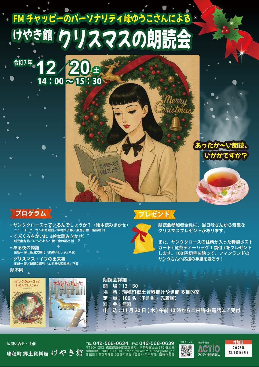 峰ゆうこの「クリスマスの朗読会」は12/20(土)、瑞穂町けやき館にて開催!入場無料。来場者には峰からクリスマスプレゼント!予約は本日11/20(木)~瑞穂町けやき館まで。来てね!!#とれたてラジオ #瑞穂町 pic.x.com/XKyIBihOQH
