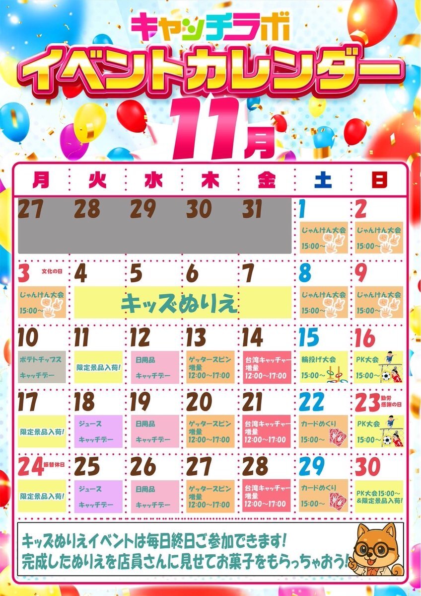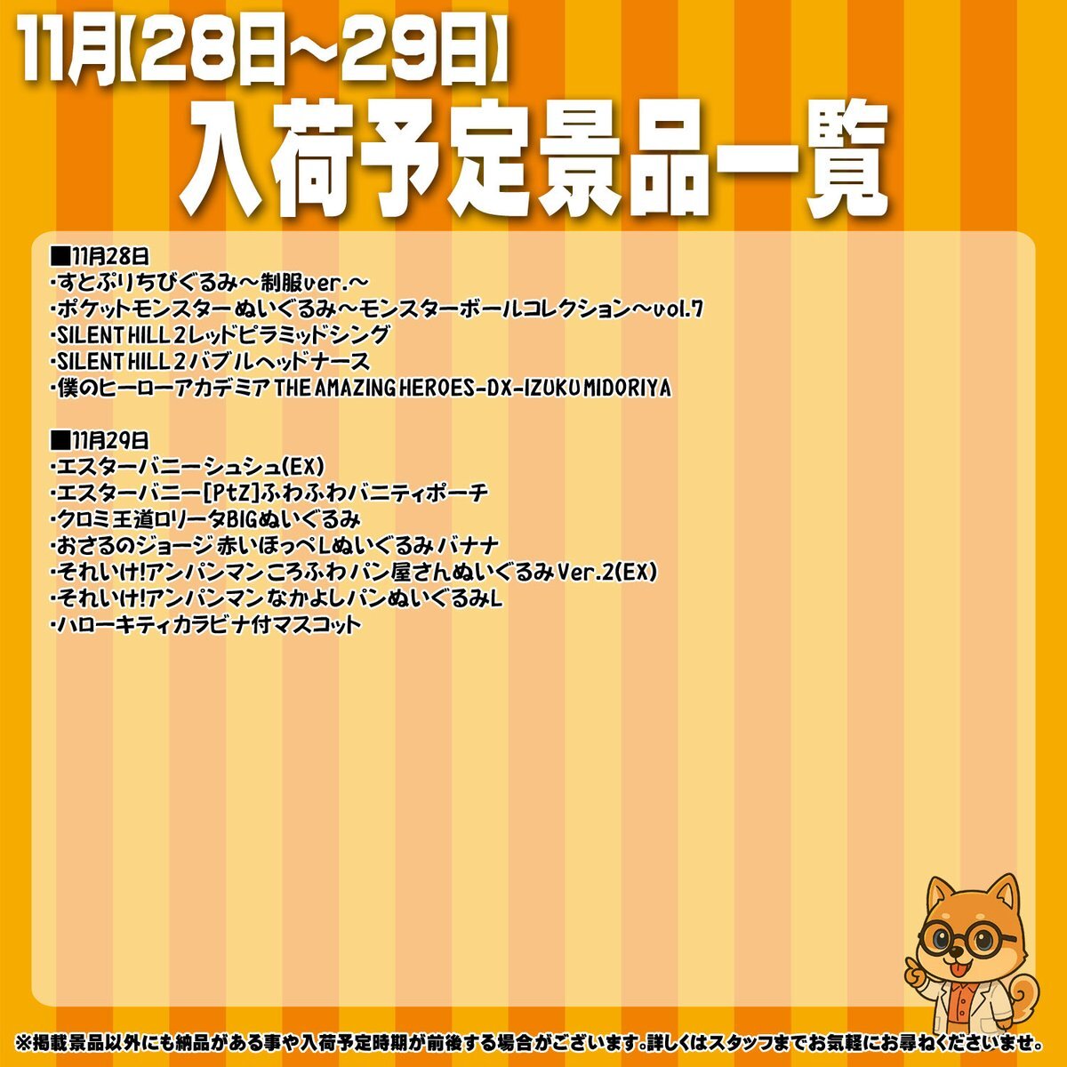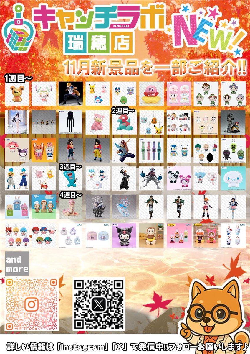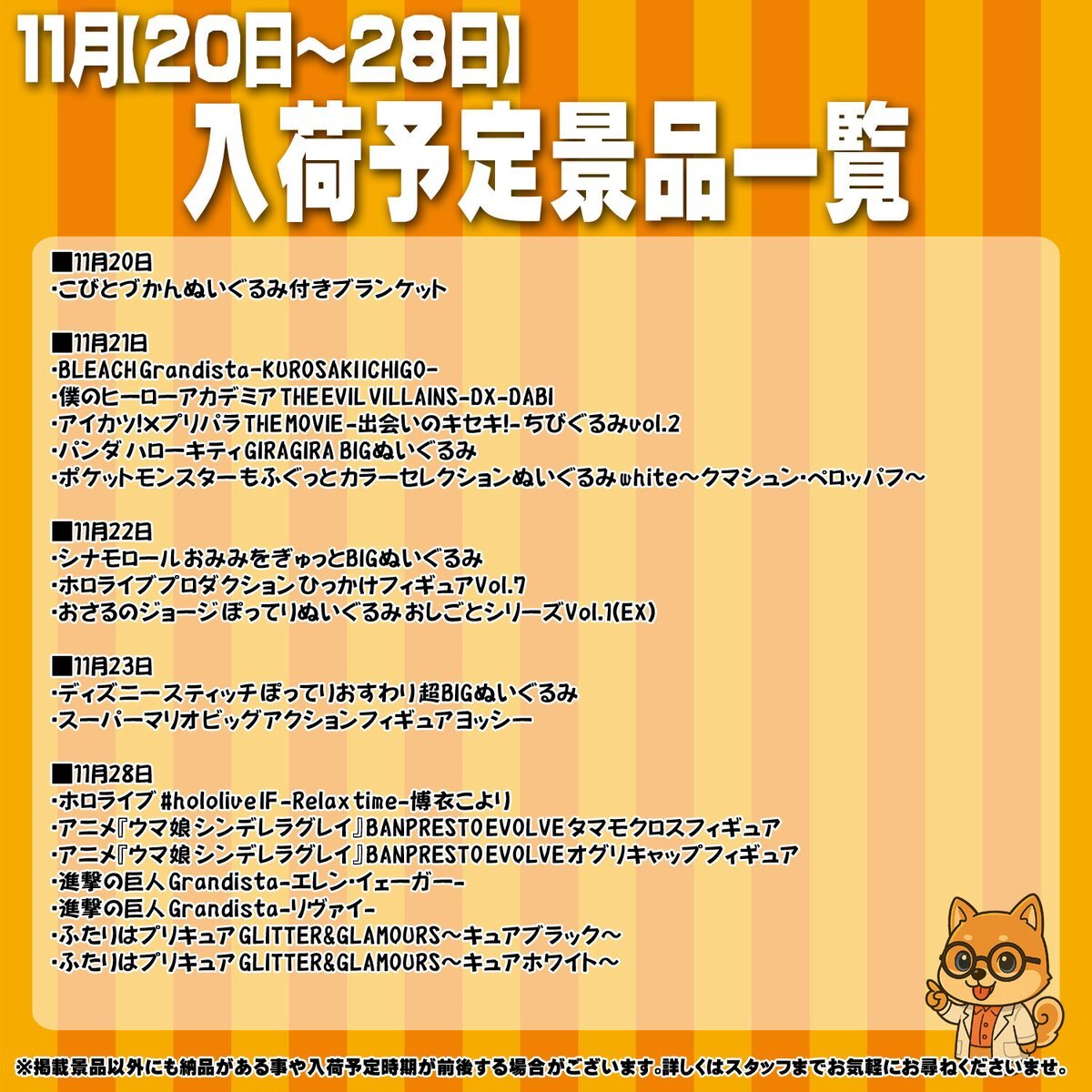 11月【20日〜29日】 🎁景品スケジュール一覧🎁 こんばんわ〜ん🐶くらげです🪼 お待たせいたしました! 景品スケジュールとなります! #キャッチラボのイベントスケジュール #入荷予定景品スケジュール #キャッチラボ #瑞穂町 #キャッチラボでまってるよ〜 pic.x.com/iuXFsac5YL