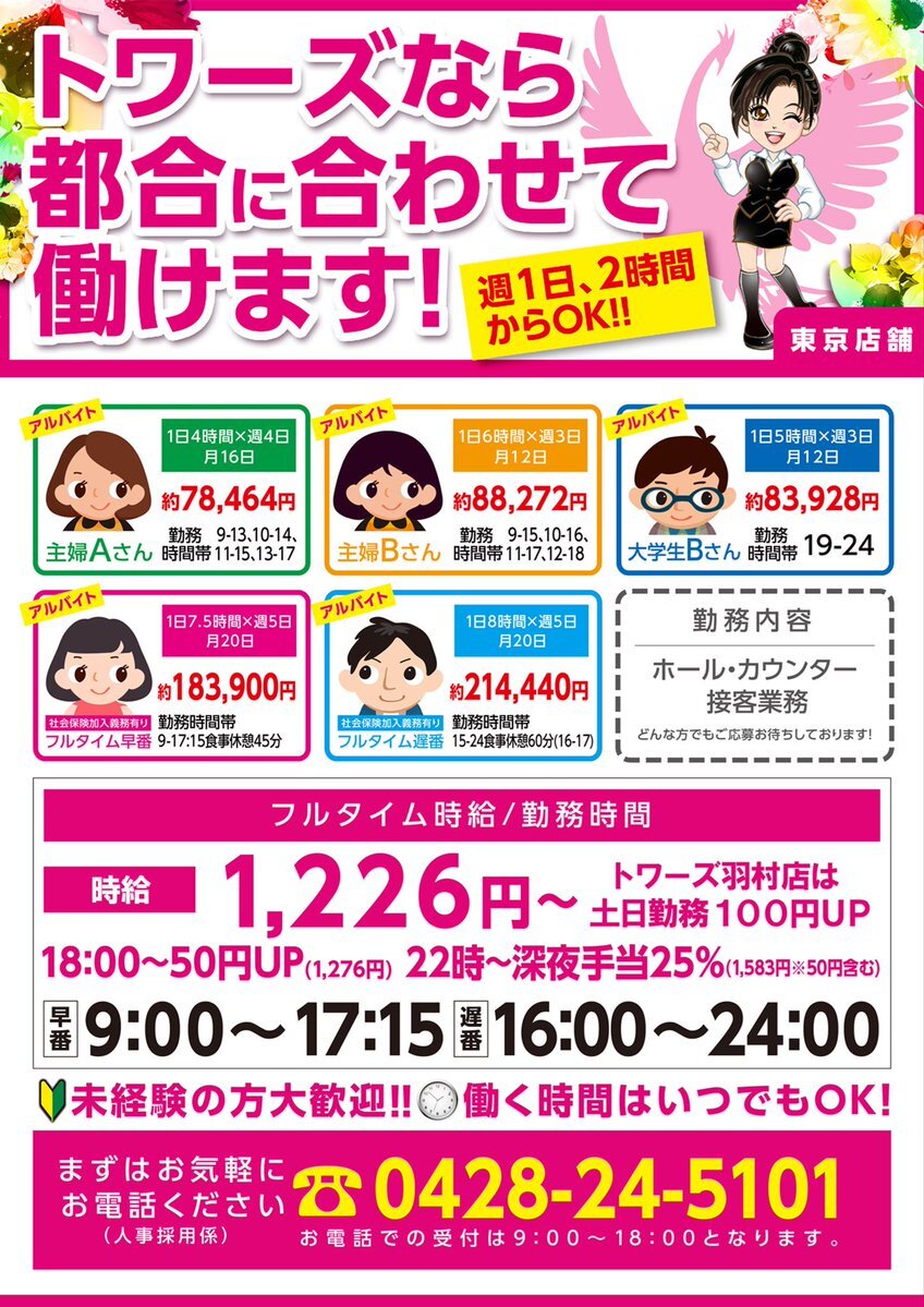 トワーズ羽村店で一緒に🌈 働いてみませんか😊😃😆 ホールスタッフ募集中❣️❣️ 初心者の方でも大歓迎です🎉 興味のある方は是非お電話を💡 人事採用係☎️ 0428-24-5101 店舗電話番号☎️ 042-554-1766 店舗HP🗒️ p-town.dmm.com/shops/tokyo/10… #羽村市 #福生市 #青梅市 #瑞穂町 #アルバイト募集 #トワーズ pic.x.com/OFoGkVIqq7