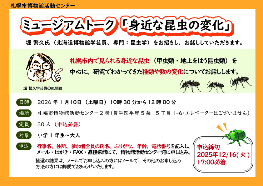 【市民文化局】 博物館活動センターにて、2026年1月10日(土)の10時30分から「身近な昆虫の変化」について、堀繁久北海道博物館学芸員にお話しいただきます!要申込。小学1年生以上向け。詳細はHP。 #博物館 #昆虫 #札幌市 #生き物 #自然 #イベント #札幌市博物館活動センター city.sapporo.jp/museum/activit… pic.x.com/R0Jjhknsh1