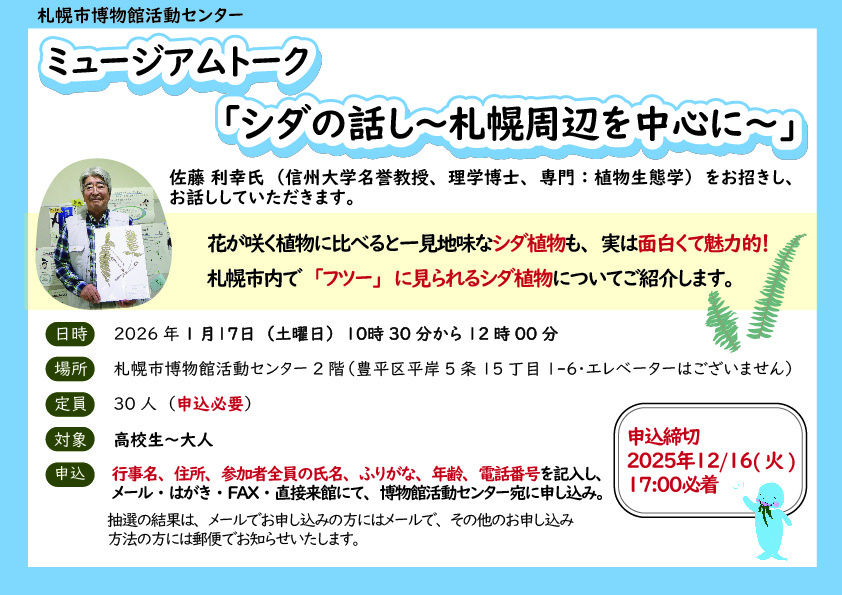 【市民文化局】 博物館活動センターにて、2026年1月17日(土)の10時30分から、シダ植物について佐藤利幸氏(信州大学名誉教授、理学博士)にお話しいただきます!要申込。高校生以上向け。詳細はHP #博物館 #植物 #札幌市 #生き物 #自然 #シダ #札幌市博物館活動センター city.sapporo.jp/museum/activit… pic.x.com/MvMJdTBMjj
