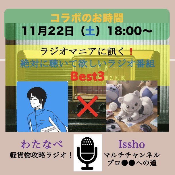 11月22日(土)18:00〜 音声配信アプリstand fmの私のチャンネルにて、 ラジオが人生の一部と言っても過言ではないという、軽貨物ドライバーのわたなべさんを再びゲストにお迎えして、オススメ番組Best3を語って頂きます❗️ 放送はコチラから↓ stand.fm/channels/66b3b… #ラジオ #コラボ #生放送 pic.x.com/H0htIrGQP7