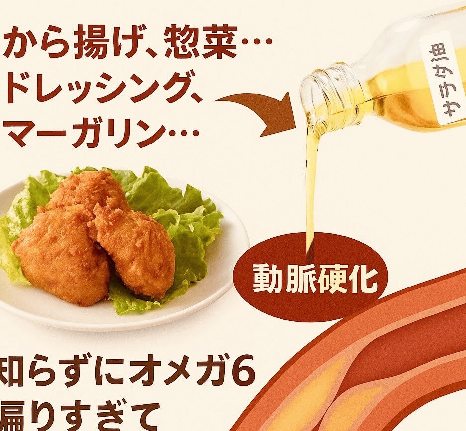 サラダ油=オメガ6脂肪酸。唐揚げ、惣菜、ドレッシング…知らずに摂りすぎていませんか? オメガ6の過剰摂取は動脈硬化のリスクに。 オリーブ油や青魚のオメガ3とのバランスが大切。 #生活習慣病 #油の選び方 #オメガ6 pic.x.com/zESbzjc2HR