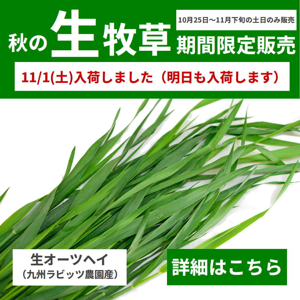 10/26(日)、#生牧草 入荷しました! 九州ラビッツ農園産の生オーツヘイです。 11月下旬まで土日のみ店舗限定販売いたします。 次回、11/1(土)入荷予定です。 1袋 約100g入り 550円(税込) pic.x.com/Dblen96scK