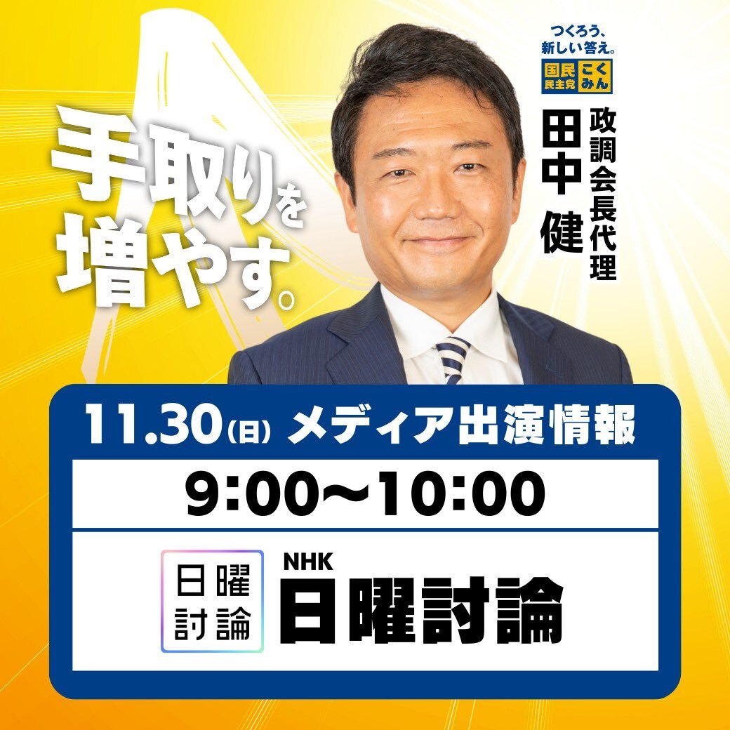 【出演情報】 11月30日(日)、#田中健 政調会長代理が以下の番組に出演します。ぜひご覧ください🐰 ◆NHK「日曜討論」 9:00〜10:00 nhk.jp/p/touron/ #国民民主党 #手取りを増やす