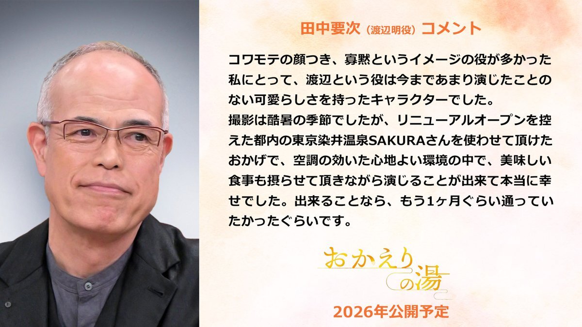 🟠コメント到着🟠 #田中要次 さん /渡辺明役 渡辺という役は今まで あまり演じたことのない 可愛らしさを持った キャラクターでした。 映画『#おかえりの湯』♨ 2026年 全国公開予定! pic.x.com/dE1d45EfDD