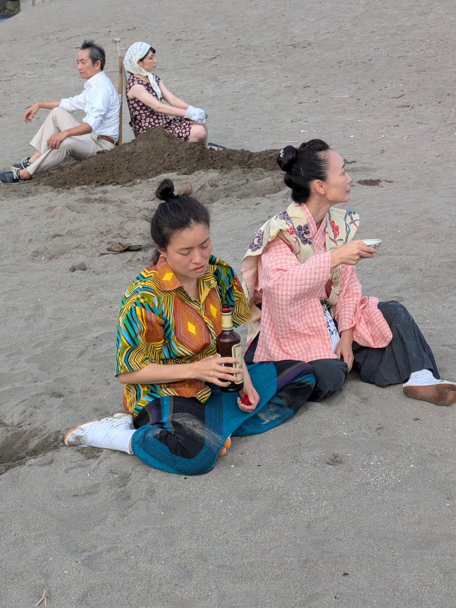 。声は風に乗ってかき消えないように少し張って、どうみえてんのかなー…とか思いながら仲間に頼りながら1時間頑張りました。 とりあえず喉に砂が入ってザラザラしました。観て頂いたお客様、本当にありがとうございました。野外の自信が一つつきました。 #平原演劇祭 #由比ヶ浜 pic.x.com/DD9qPDUf4a