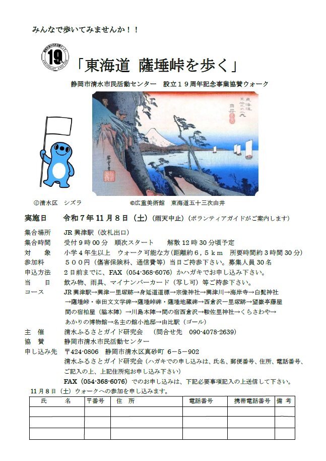 11/8(土)に #静岡市清水市民活動センター 設立19周年記念事業『東海道 薩埵峠を歩く』が開催☆ 参加する方は、11/6(木)までに申込むラ~! #興津 駅から #薩埵峠(さったとうげ)、#由比 駅まで、ボランティアガイドと一緒にみんなで歩こうラ~🚶 申込・詳細は、チラシをチェック! #シズラ #清水区 pic.x.com/SfSKHUnLNd