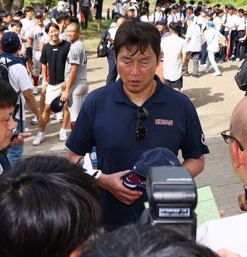 【応援に駆けつけました💨】 広島・新井貴浩監督×甲南・新井颯真選手の親子ほっこりショットです📸 甲南対西宮今津 取材を受ける広島新井監督を笑顔で見つめる次男・颯真(左奥)(撮影・上山淳一) #高校野球 #甲南 nikkansports.com/baseball/highs… pic.x.com/uYd5FxC2VT
