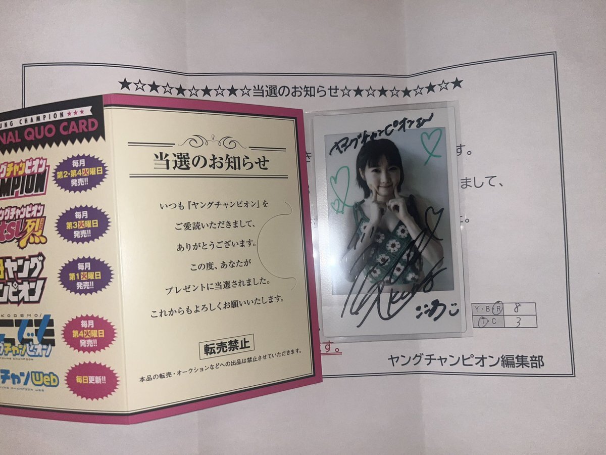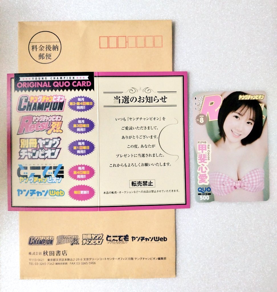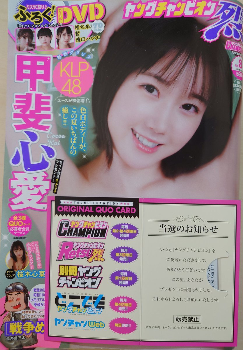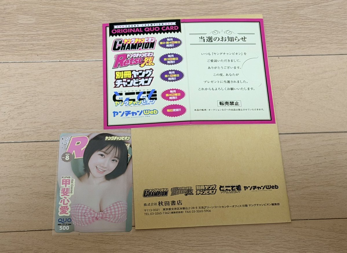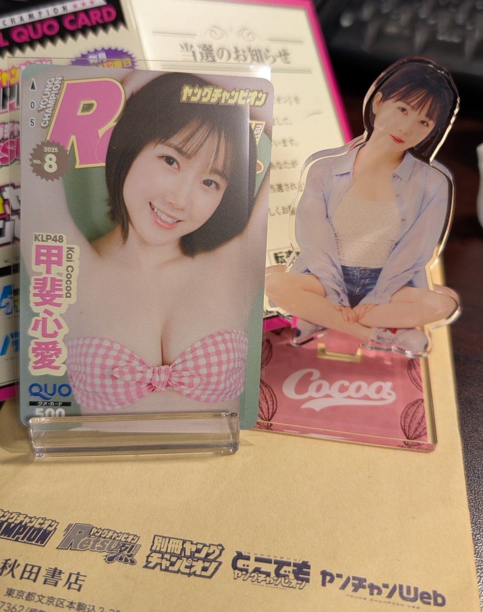 秋田書店さんから心愛の応募者全員のクオカード届いたと思ったら、抽選の方が当たってました〜 このピンクの水着可愛いのよ 心愛推しの娘がめちゃ悔しがってましたwww #甲斐心愛 #KLP48 #cocoaKLP48 #ヤングチャンピオン烈 pic.x.com/Bz4CaaOxtC