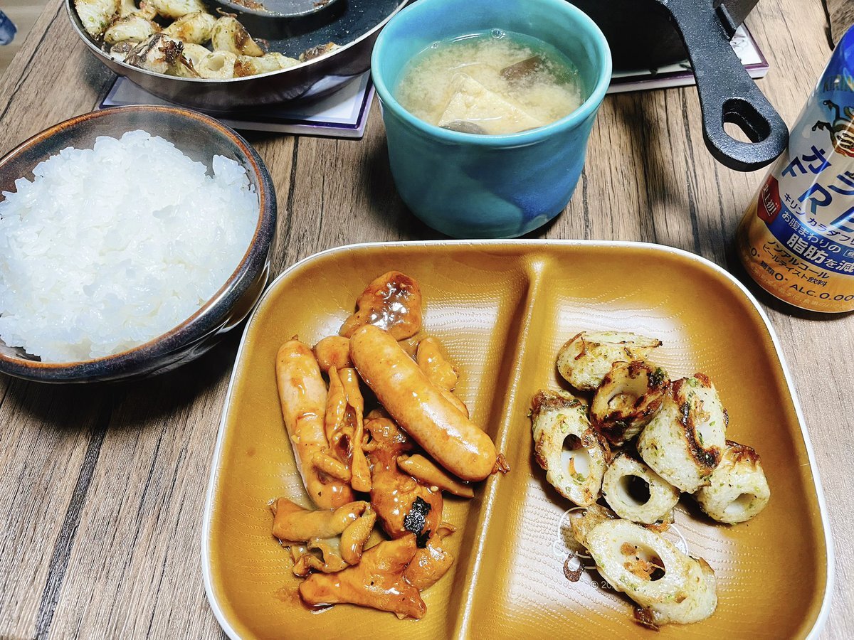 今日はこてっちゃんとウィンナーの激辛煮、ちくわのカリカリ焼き、茄子と厚揚げのお味噌汁 手袋解禁 #男の料理 #おうちごはん #twitter料理部 #Twitter家庭料理部 pic.x.com/bQvGvaO5t2