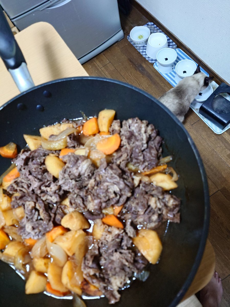 男のマッスルクッキングは肉じゃが お水を飲むショコラたんもいます。 ちなみにロシアのめちゃデカいボディービルダーは1日20000kcal食べるそうです(白目) #猫好きさんと繋がりたい #猫のいる暮らし #筋肉声優 #男の料理 pic.x.com/EhAKsmqjjl