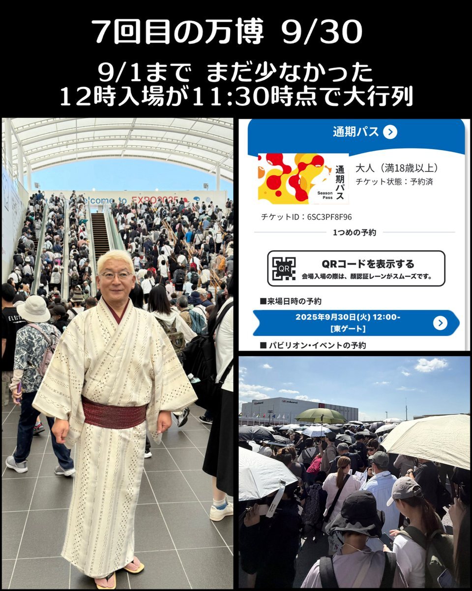 7回目の万博 9/30 9/1にまだ少なかった 12時入場が 11:30時点で大行列😱 . #万博 #大阪関西万博 #expo #expo2025 #expo2025osaka #expo2025japan #大阪万博 #万国博覧会 #夢洲 #ゆめしま #男着物 #男着物コーディネート #着物男子 #着物男子コーデ #着物旅行 #着物旅行家 #着物で万博 #夏着物 pic.x.com/UEksytZ3hI