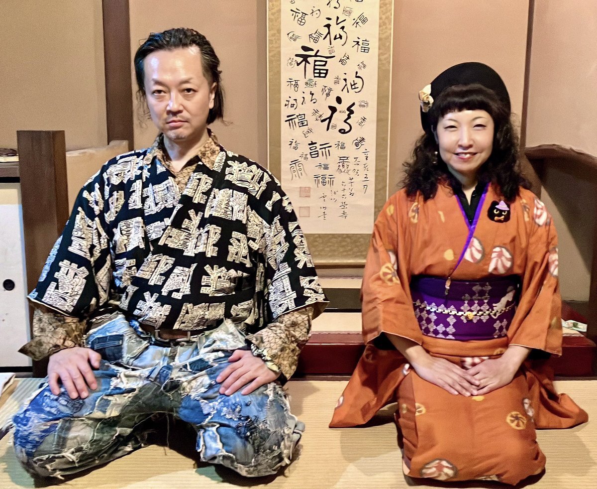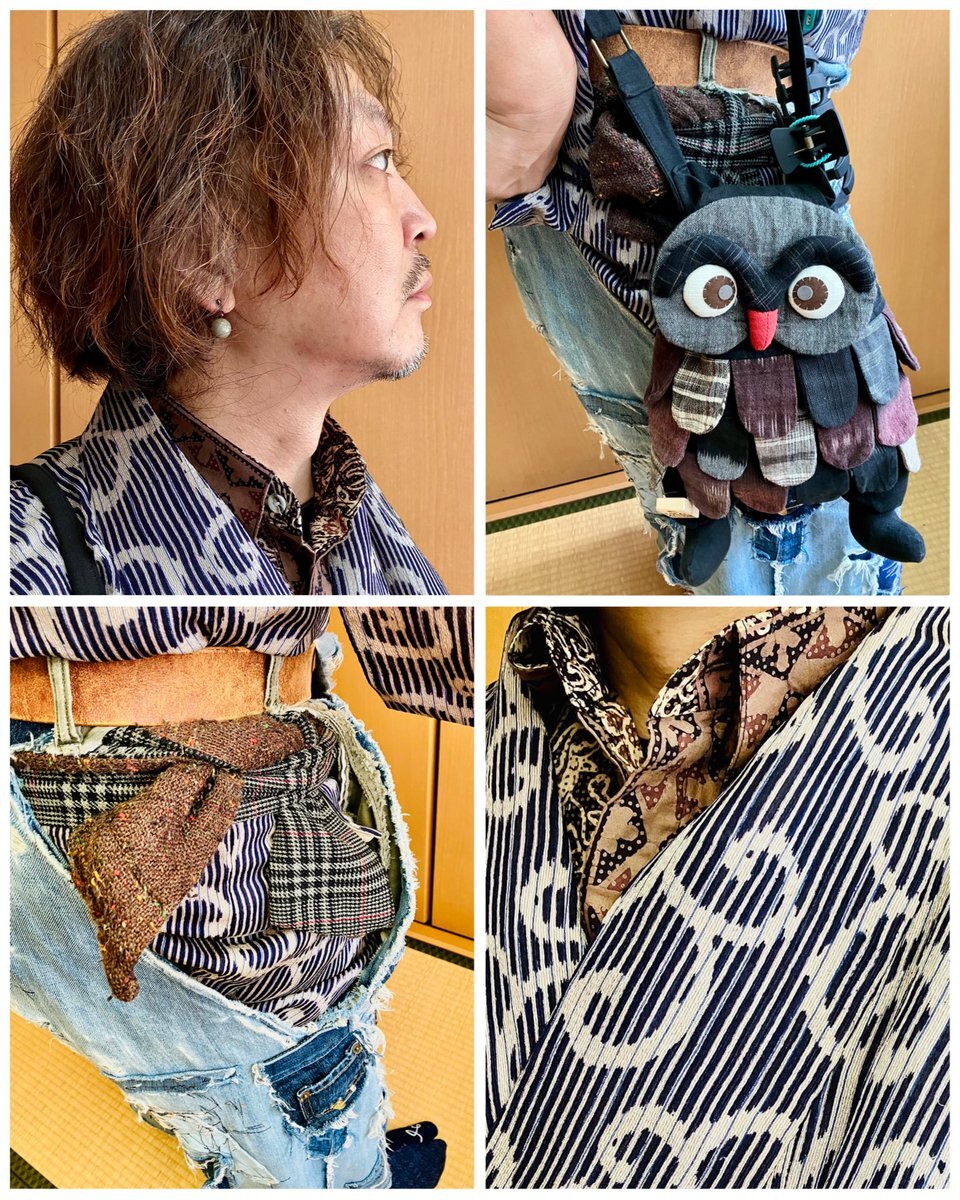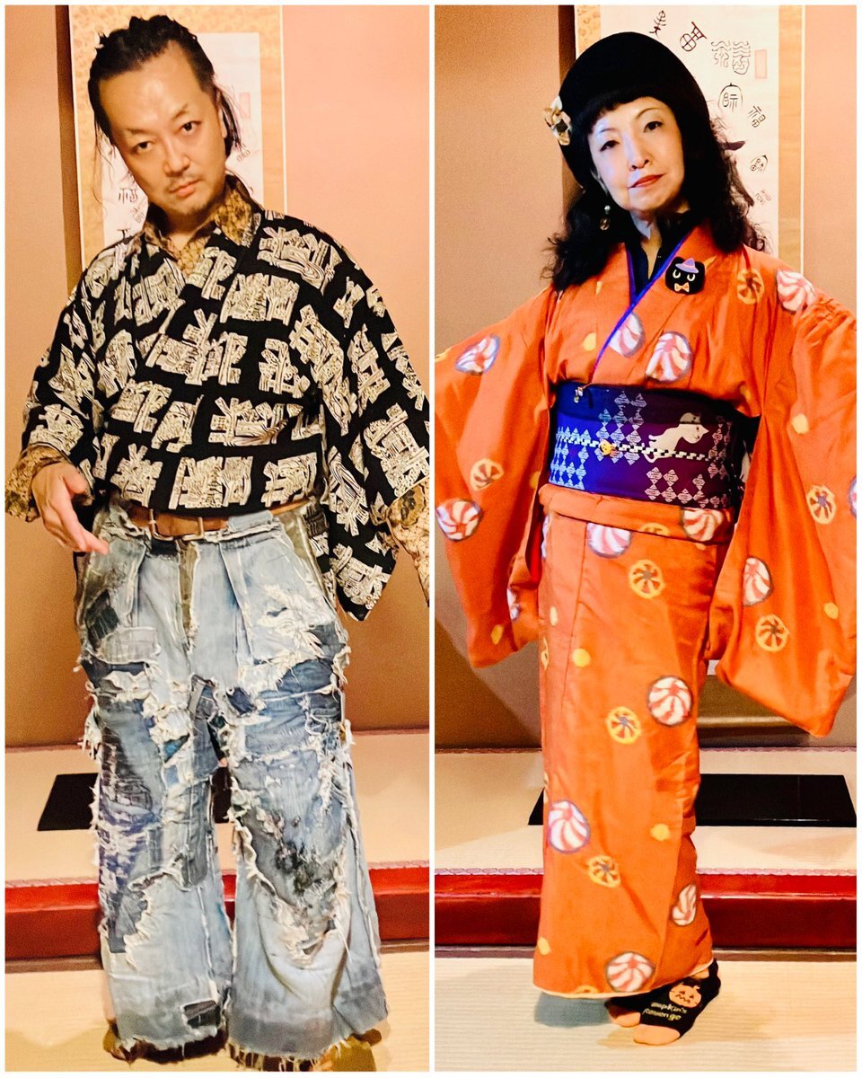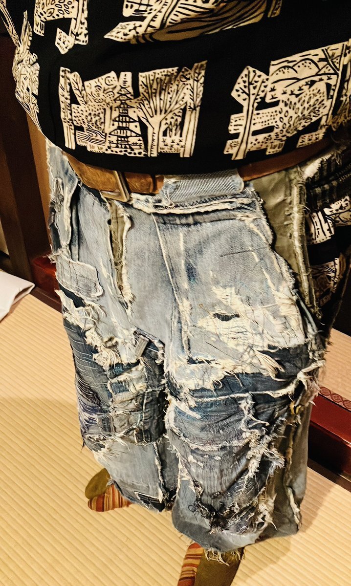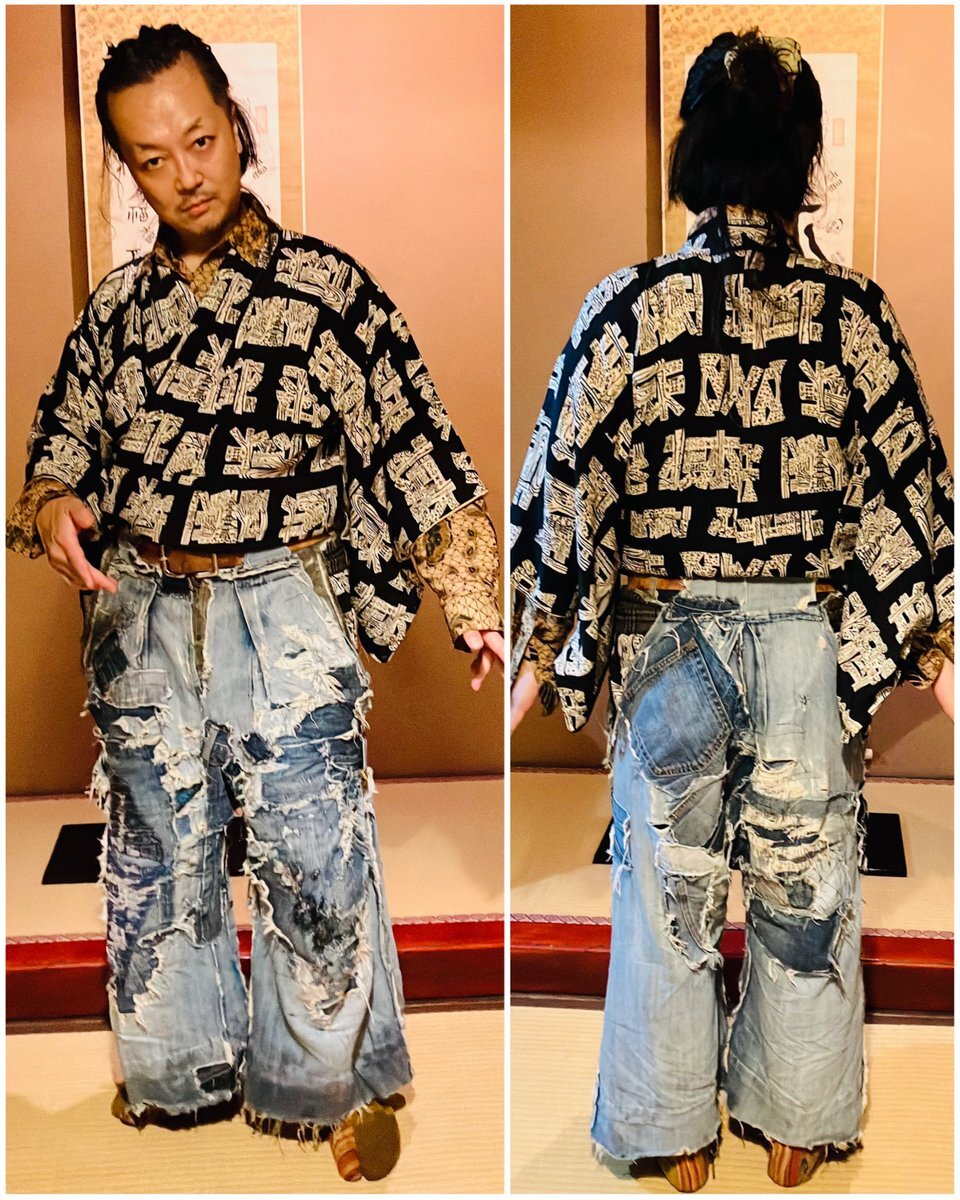 ◆殿→黒地に手描きで五重の塔とか描かれている着物(女物) 中はバティックのシャツ 袴は自作リアルダメージデニム袴 ベルトをしているのでズボンと思われがちですが脇の開いてる袴仕立て 自作の紐足袋は昔履いてたズボンと ウールの着物ハギレのコンビ 紐は靴紐を使いました #男着物 #袴 #着物コーデ pic.x.com/y9PNWUxybR