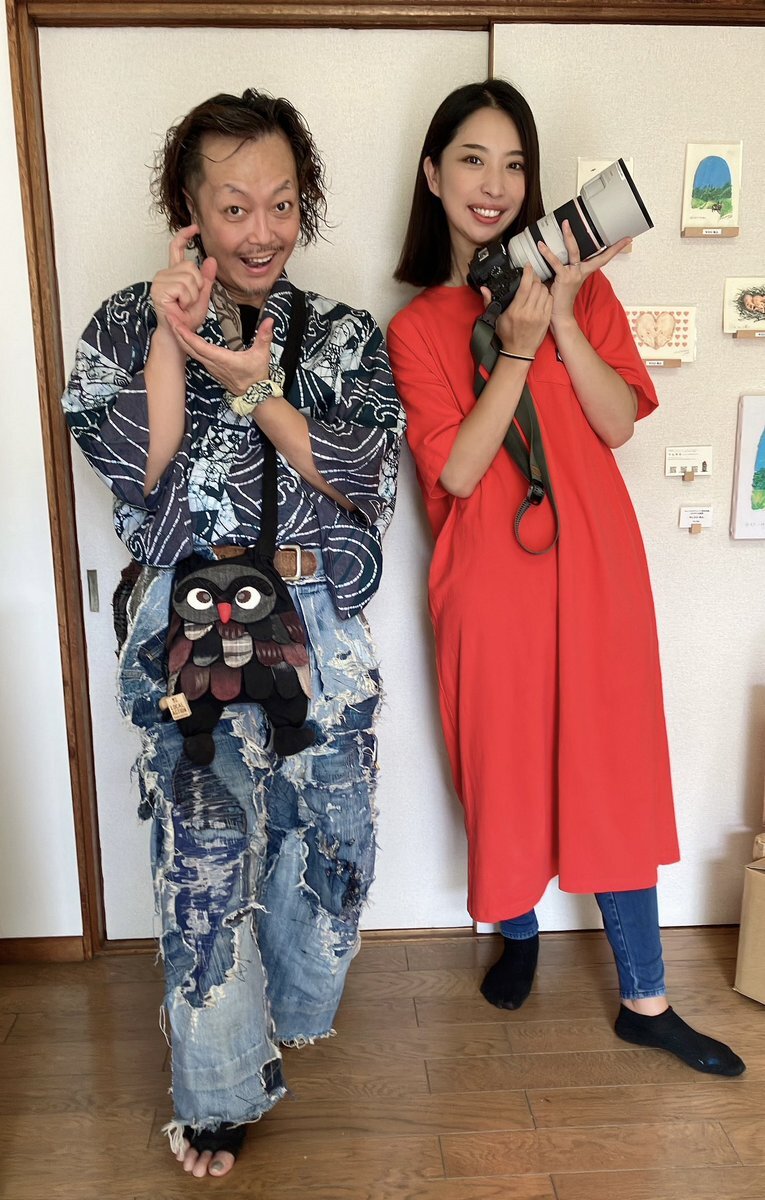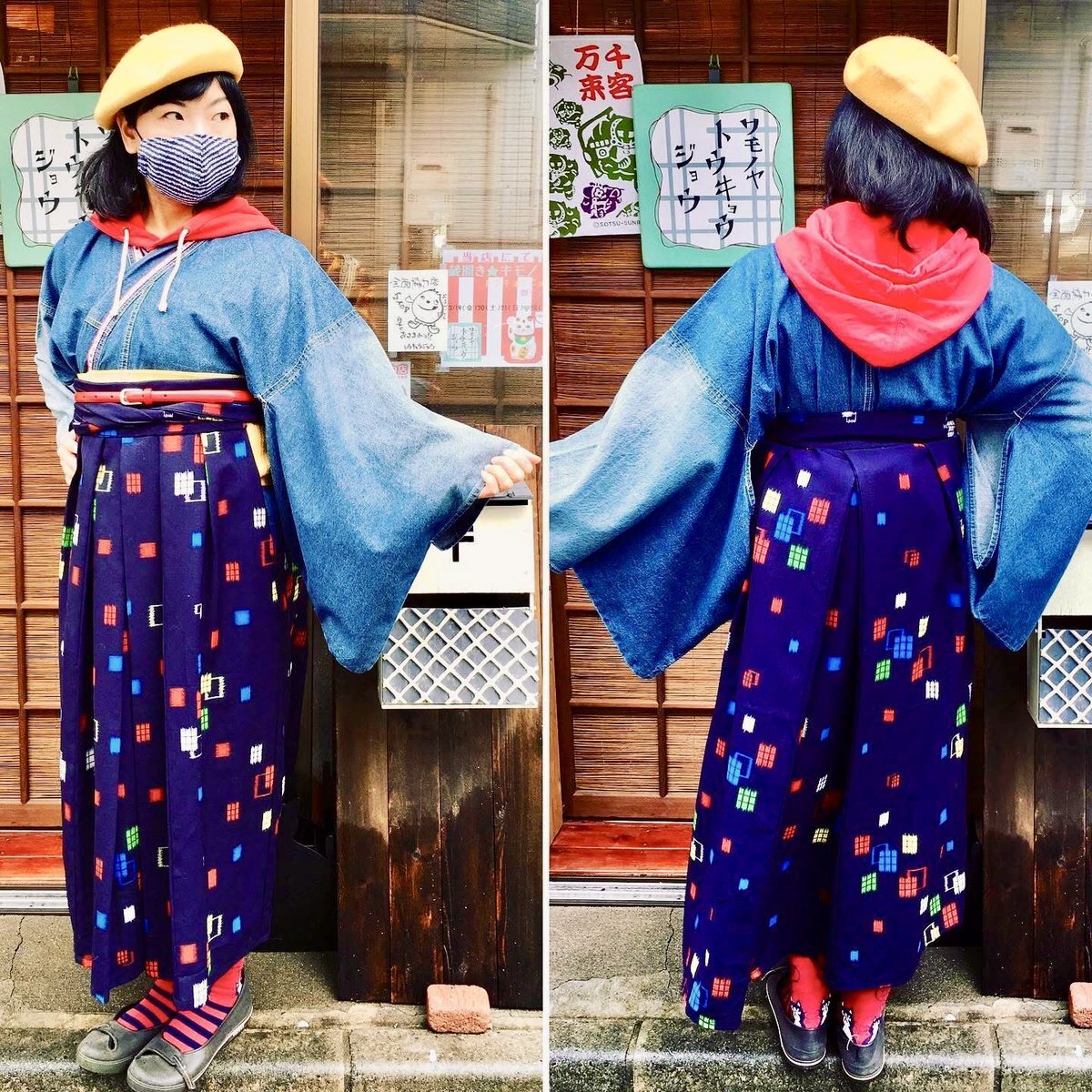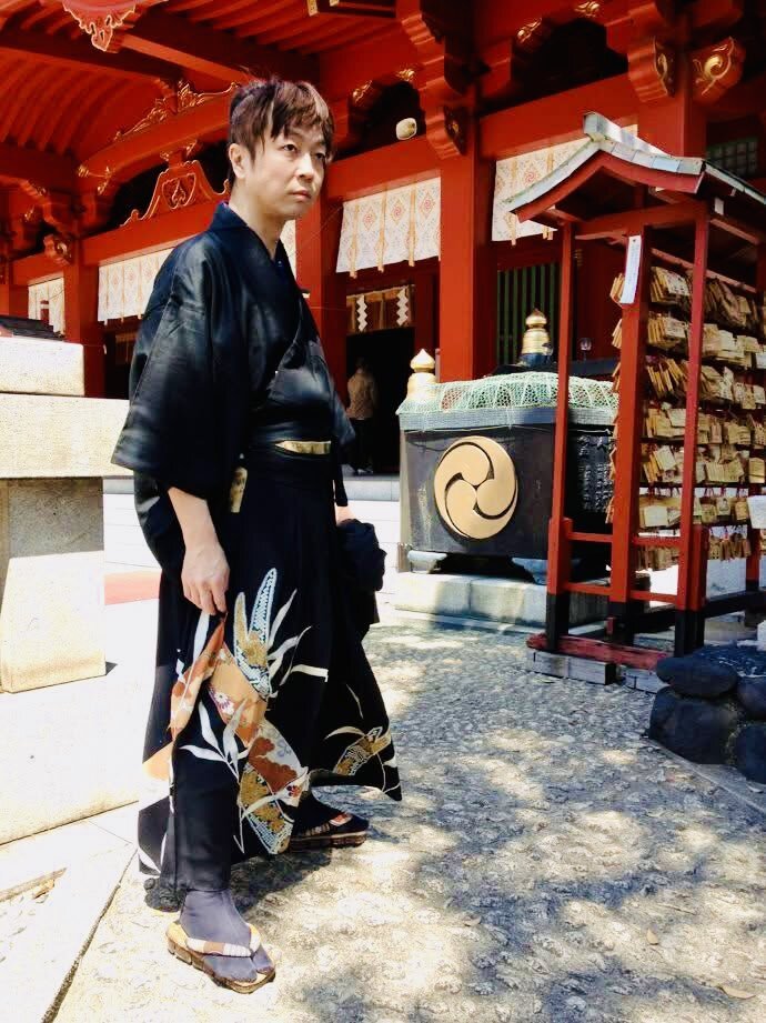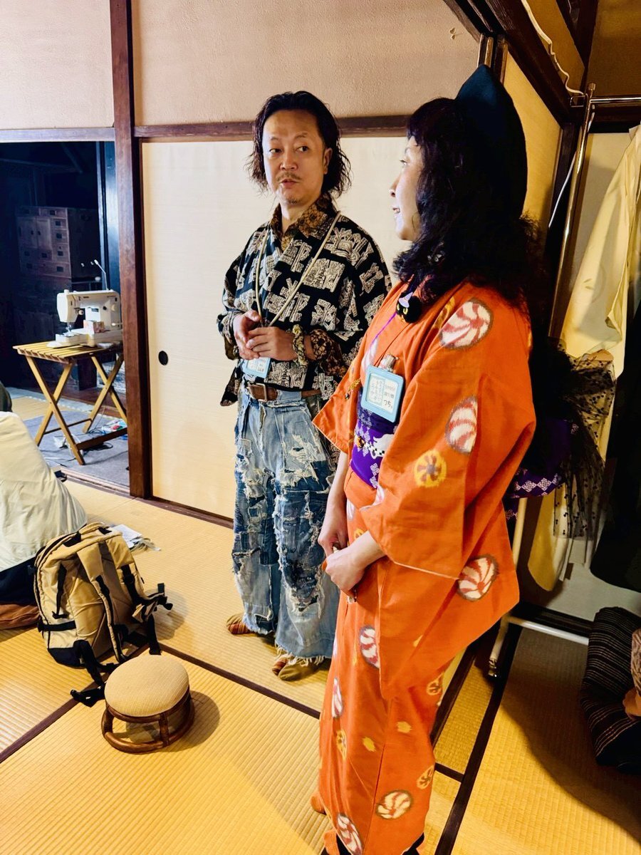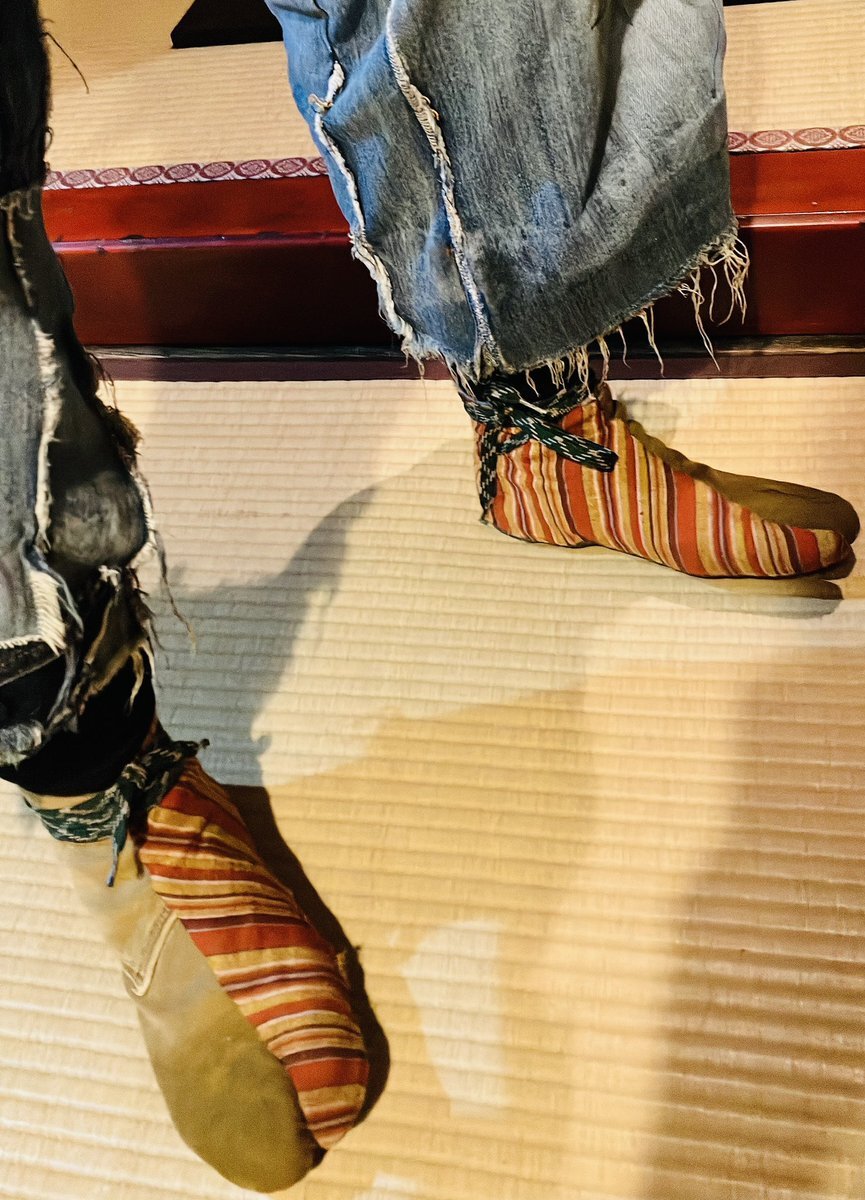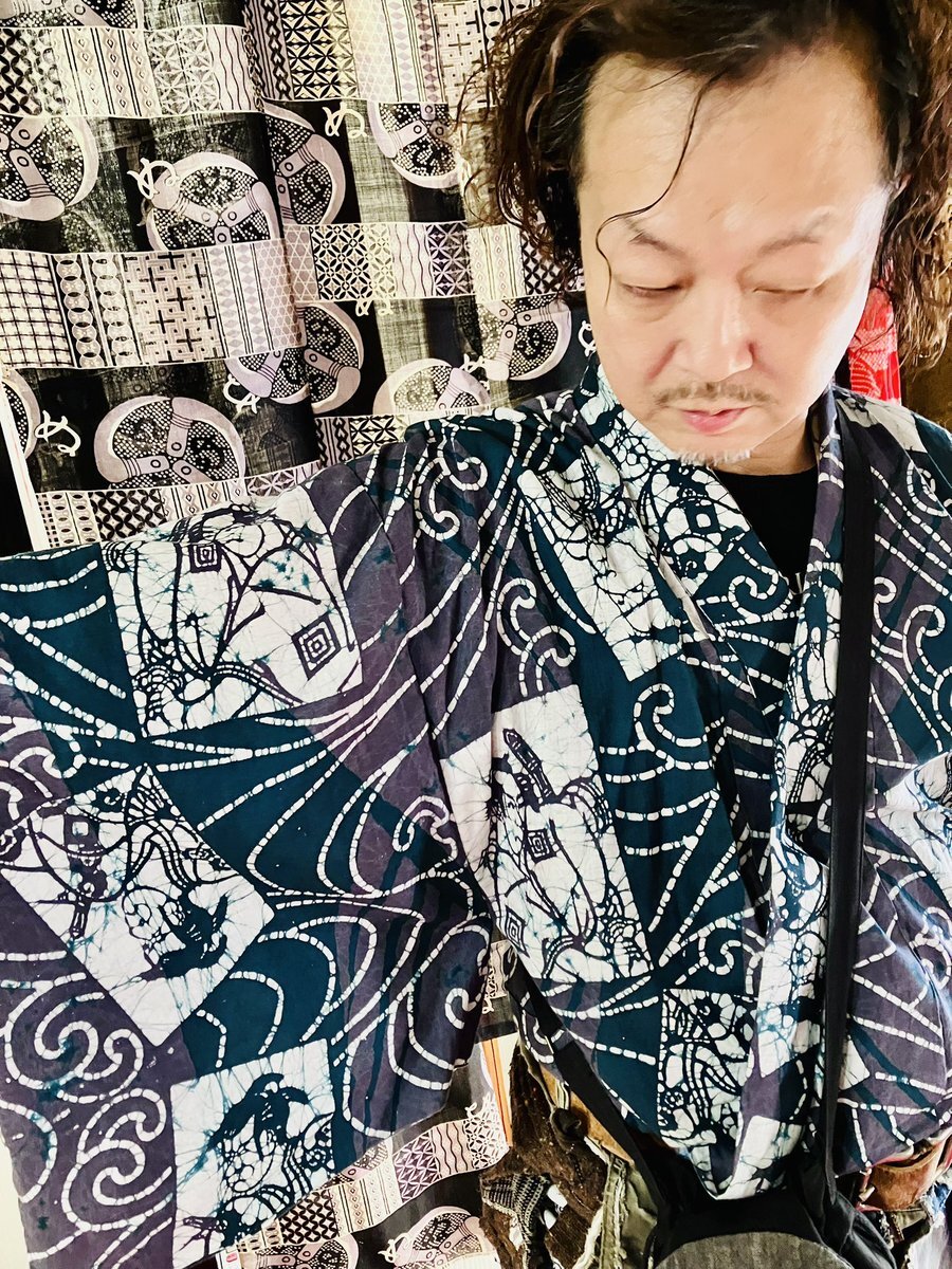 ◆殿→黒地に手描きで五重の塔とか描かれている着物(女物) 中はバティックのシャツ 袴は自作リアルダメージデニム袴 ベルトをしているのでズボンと思われがちですが脇の開いてる袴仕立て 自作の紐足袋は昔履いてたズボンと ウールの着物ハギレのコンビ 紐は靴紐を使いました #男着物 #袴 #着物コーデ pic.x.com/y9PNWUxybR