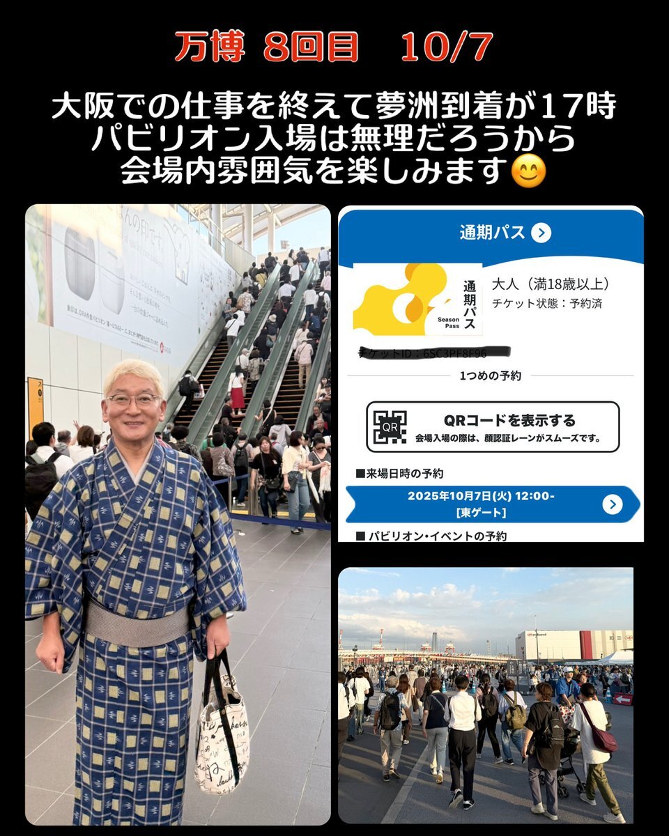 8回目の万博 10/7 大阪での仕事を終えて 17時に夢洲到着 パビリオン入場は無理だろうから 会場内の万博雰囲気を楽しみます . #万博 #大阪関西万博 #expo #expo2025 #expo2025osaka #expo2025japan #大阪万博 #万国博覧会 #夢洲 #ゆめしま #男着物 #男着物コーディネート #着物男子 pic.x.com/XBLlwcYTKB