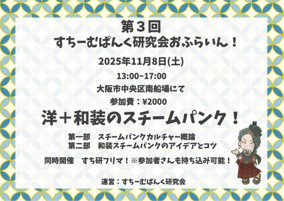 第三回すち研おふ!大阪開催!和装スチームパンクのアイデアを共有して海外にもどんどん発信していきましょう〜😘✨先程ツイプラ↓立てました🙆♀️初めての方もスチームパンクよくわからん!て方も、お友達誘ってぜひお越しくださいな🥰✨ #すちーむぱんく研究会 #すち研 #すち研おふ
