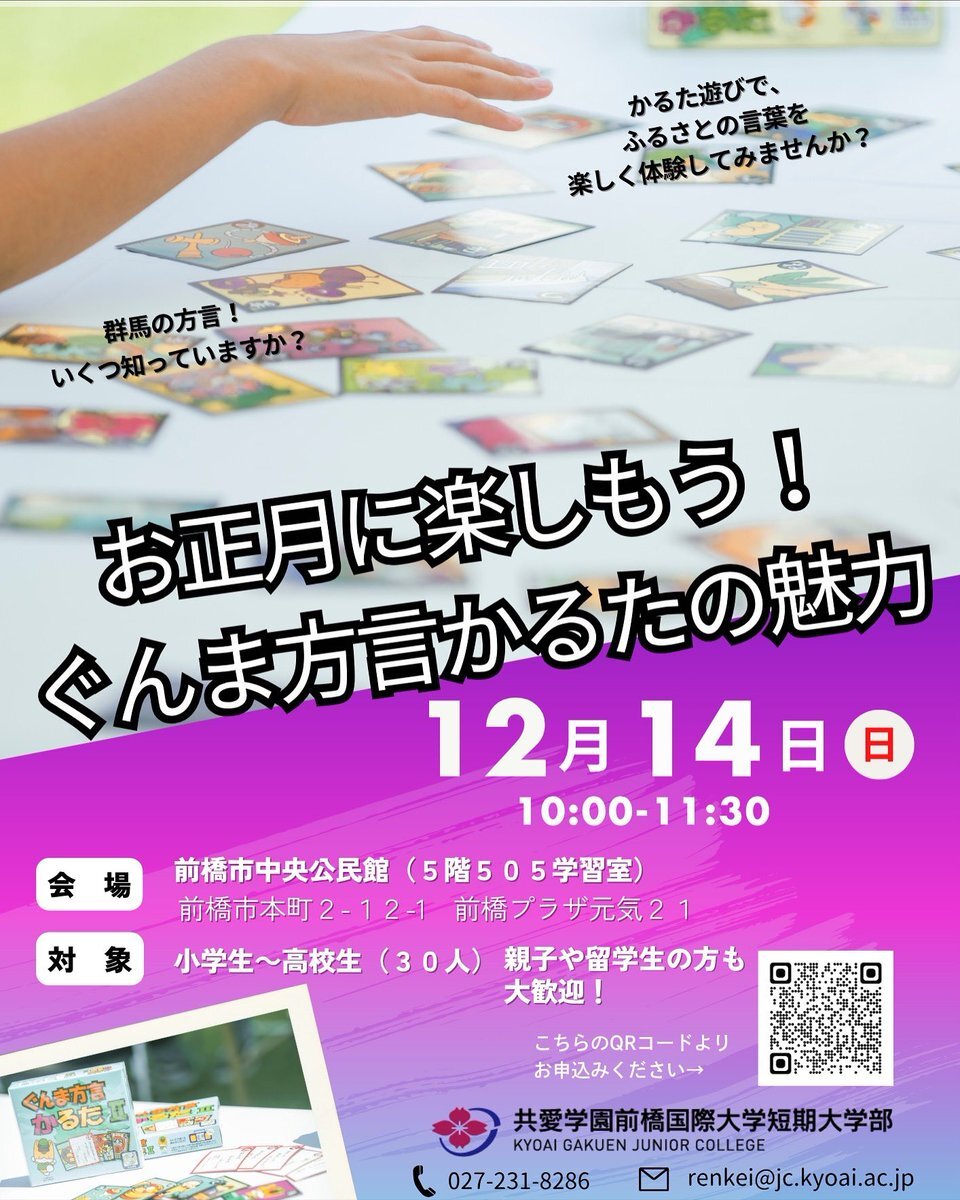 📣イベント情報 「ぐんま方言かるたで遊ぼう!」 今回は ジャンボかるたも登場! 親子・友だち同士・留学生の参加も大歓迎✨ 🗓️ 12/14(日) 10:00〜11:30 📍 前橋市中央公民館 5F 505 → docs.google.com/forms/d/1sdPVt… #ぐんま方言 #イベント #親子 #留学生 #共愛短大 pic.x.com/jCersI7TIA