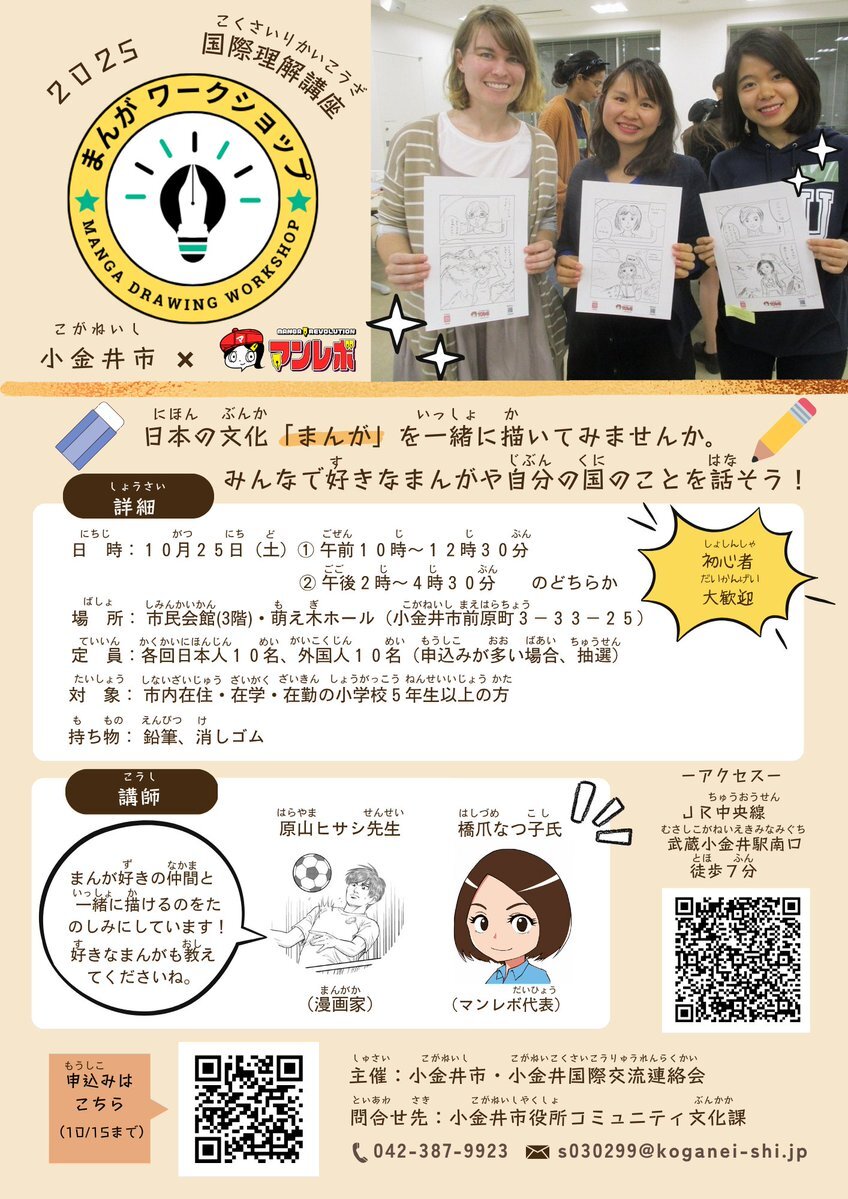 まだ募集してます!まんがワークショップ参加者募集中!まんがを一緒に書いてみませんか?【日時】令和7年10月25日(土)①午前10時~②午後2時~のいずれか【場所】萌え木ホール【申込】市申込フォームにて city.koganei.lg.jp/event/omatsuri… #koganei #小金井市 #国際交流 #留学生 pic.x.com/7orjxG3lF6