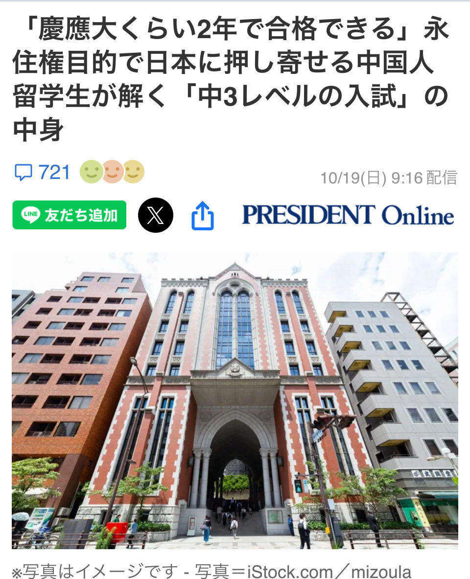 「慶應大くらい2年で合格できる」永住権目的で日本に押し寄せる中国人留学生が解く「中3レベルの入試」の中身(プレジデントオンライン) #Yahooニュース news.yahoo.co.jp/articles/043e4… #中国人 #外国人優遇 #留学生 #永住権目的 #永住権 #大学 #入試 #日本