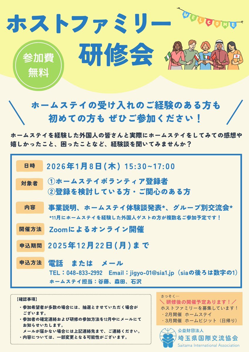 📢「#ホストファミリー 研修会」開催!🏡 #ホームステイ を経験した外国人ゲストのお話を聞いてみませんか👂 #国際交流 #留学生 にご関心のある方、ぜひお気軽にご参加ください!🌎 申込は12月22日まで! 📅2026年1月8日(木)15:30-17:00 💻オンライン開催 詳細HP▶ h7.cl/1gn1l pic.x.com/qRvxzKSjsQ