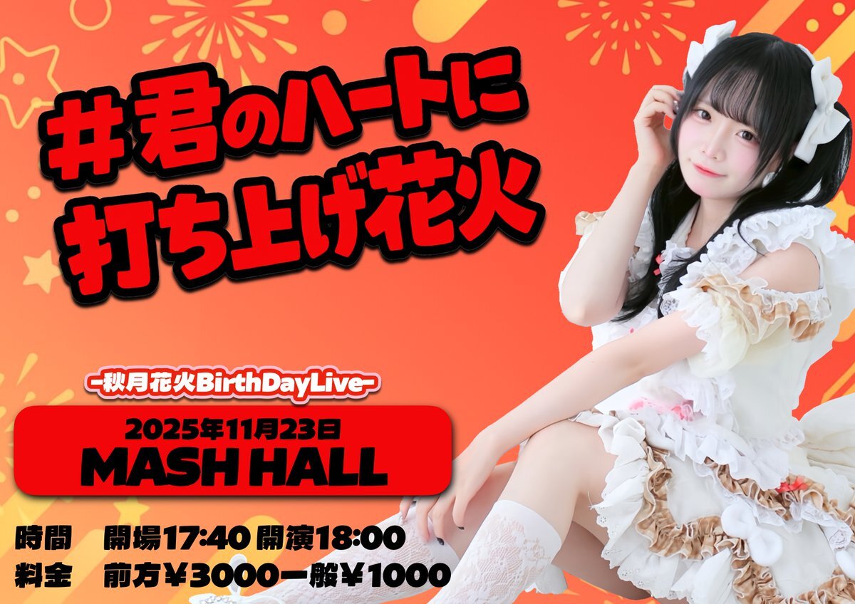 🍼ライブ情報📷 秋月花火バースデーライブ 「#君のハートに打ち上げ花火」 ▼日程 2025年11月23日 ▼開場 MASHHALL ▼時間 OPEN/17:40 START/18:00 ▼料金 前方¥3000 一般¥1000 ※各チケット1D別途 🔗:t-dv.com/hanabiBD2025 チケ発11/17(月)21:30~